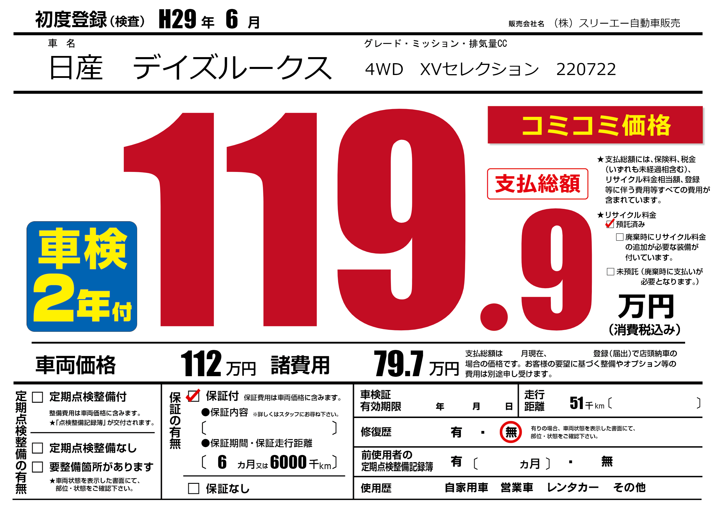 | 走行キロ | 5.1万km | 初年度登録 | H29年6月 |
