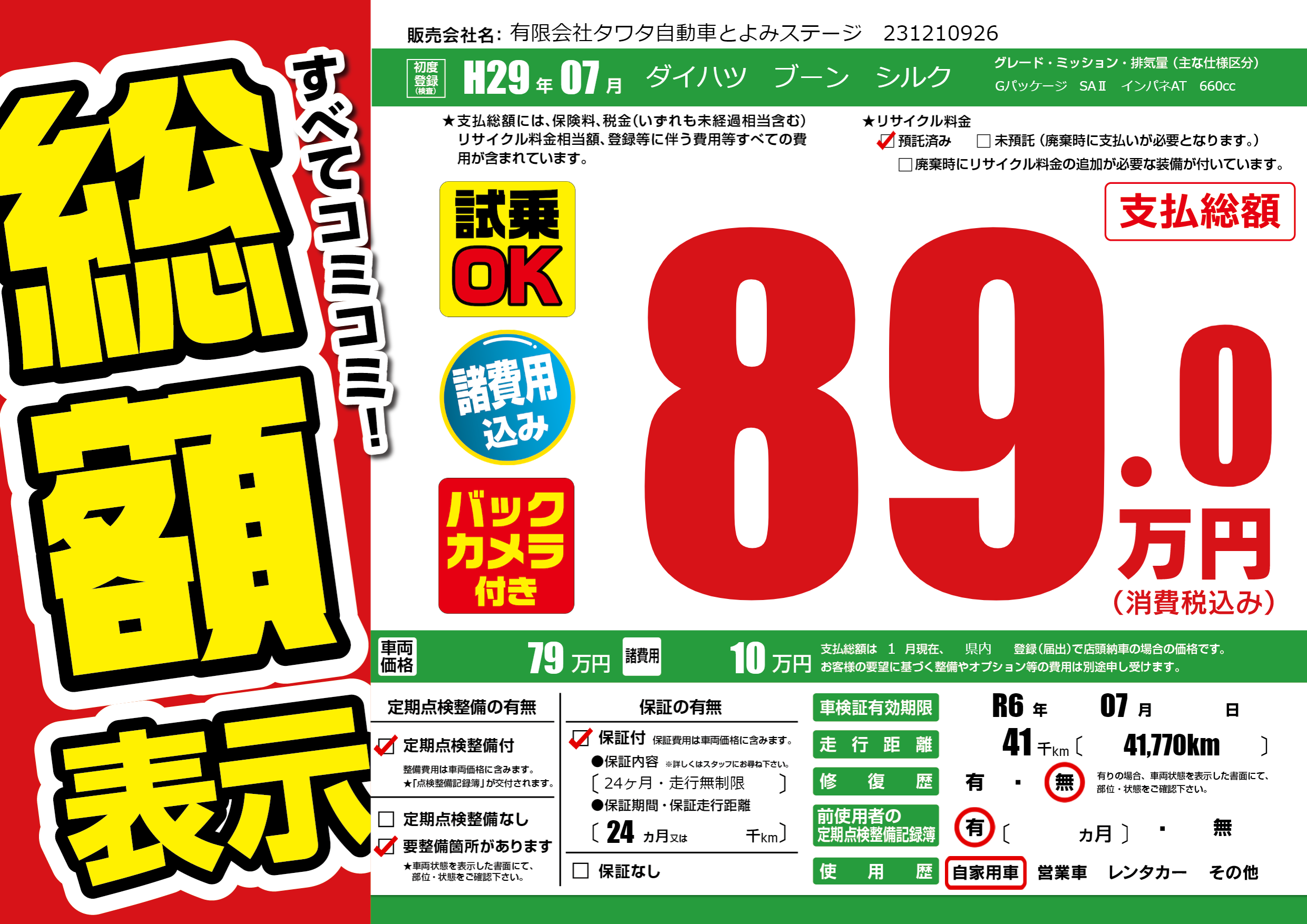 | 車名 | ダイハツ ブーン シルク | グレード ミッション 排気量 |