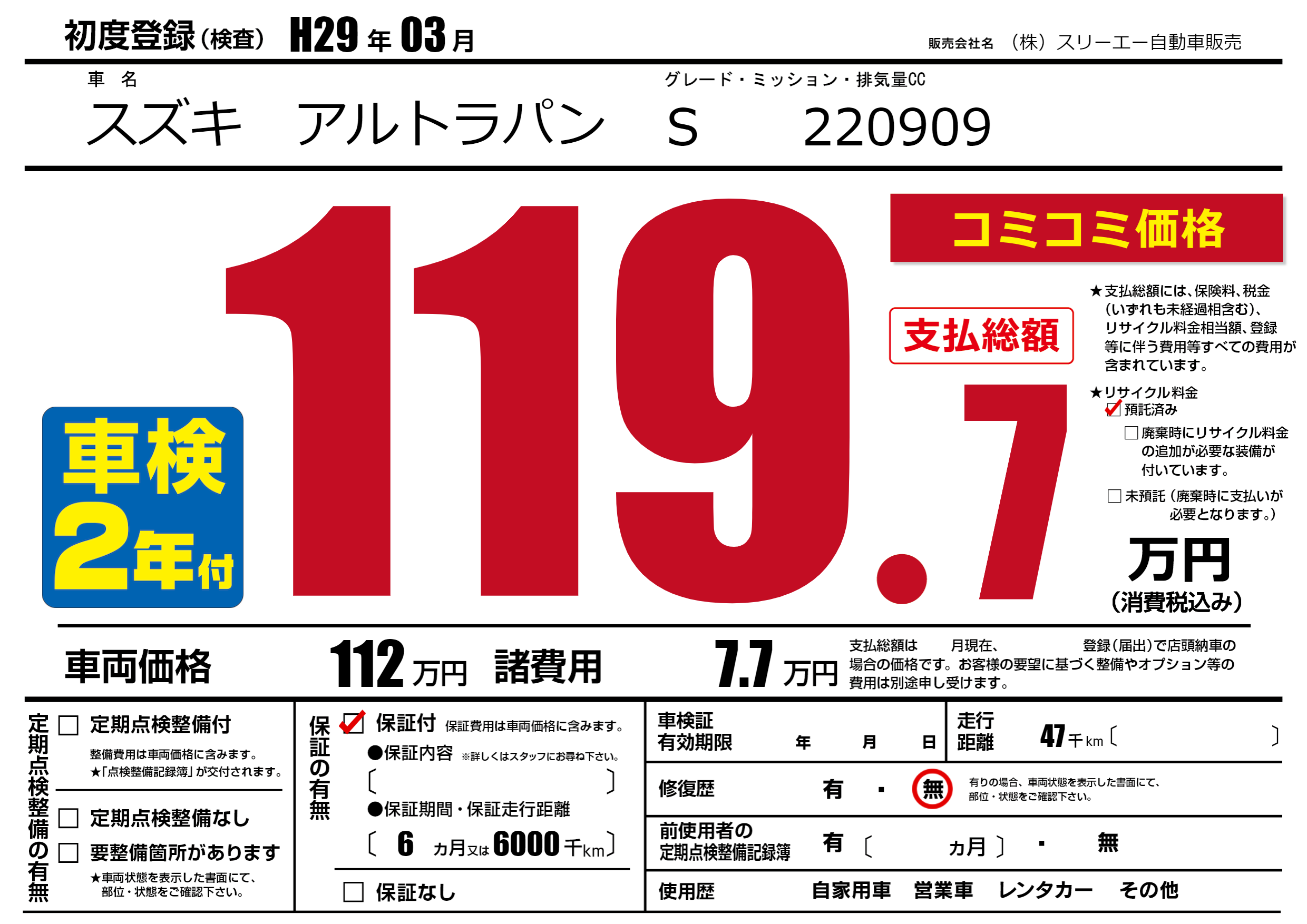 保証付き 保証内容(---) 6ヶ月または(6000)千kmまで |