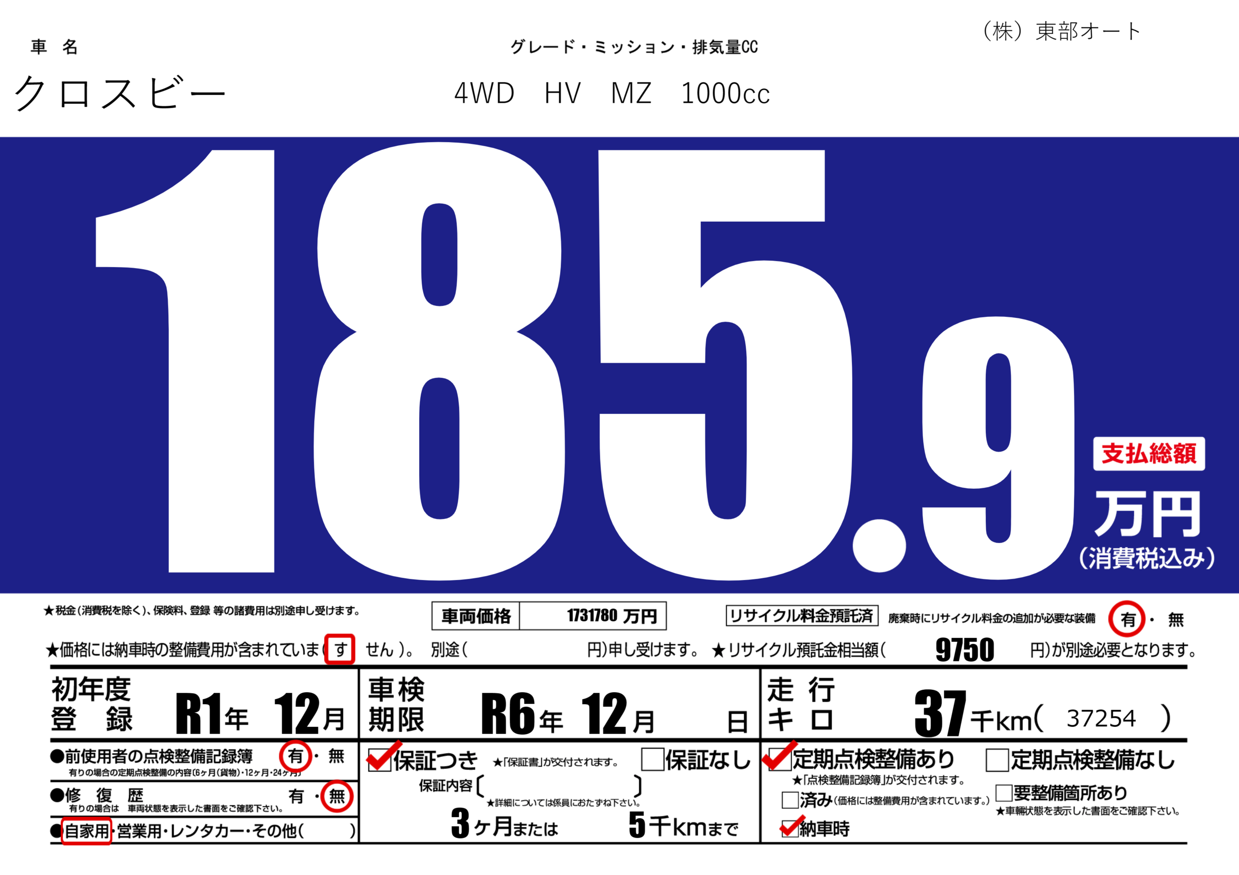 | 車名 | クロスビー | グレード ミッション 排気量 |