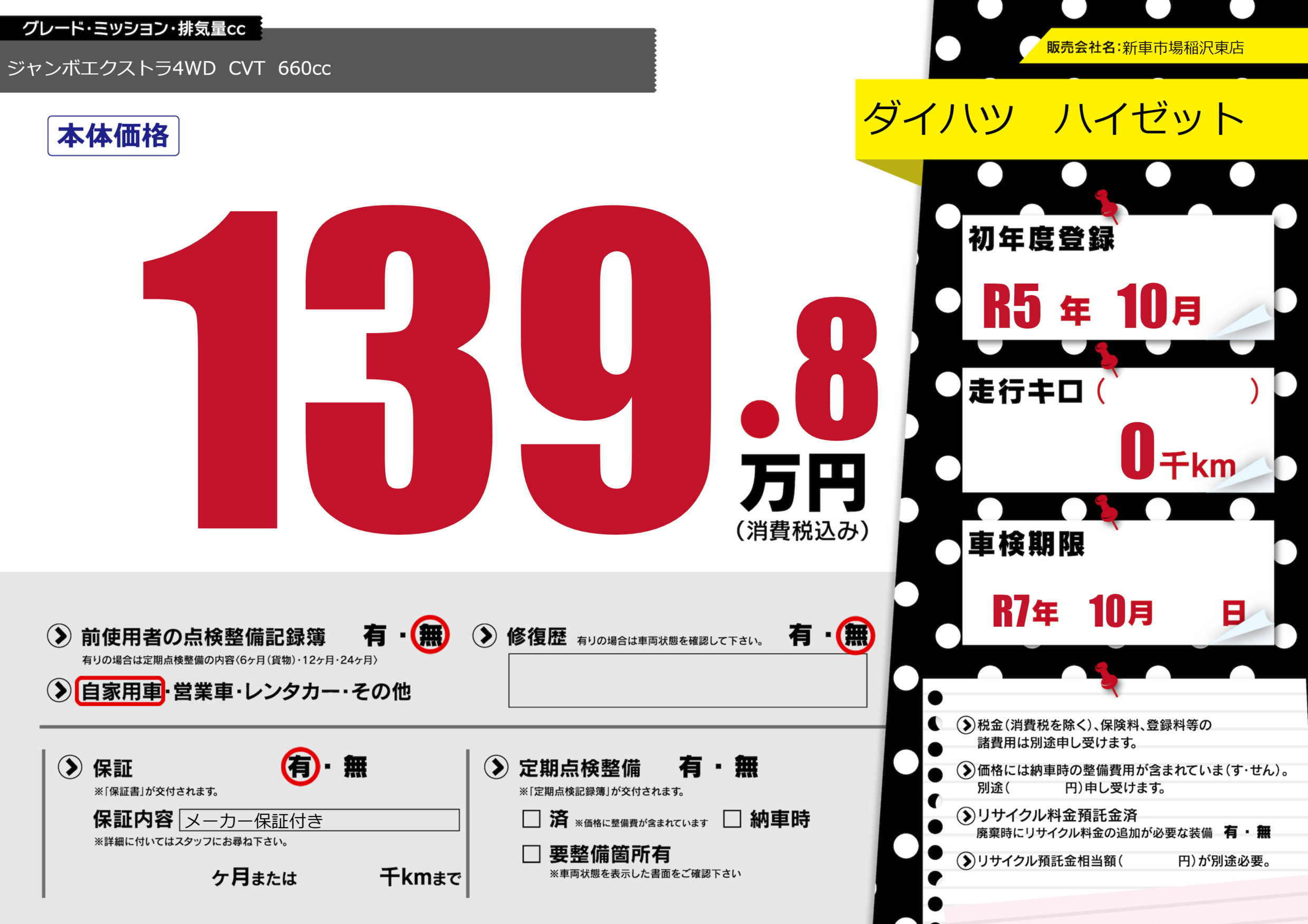 | 走行キロ | - | 初年度登録 | R5年10月 |