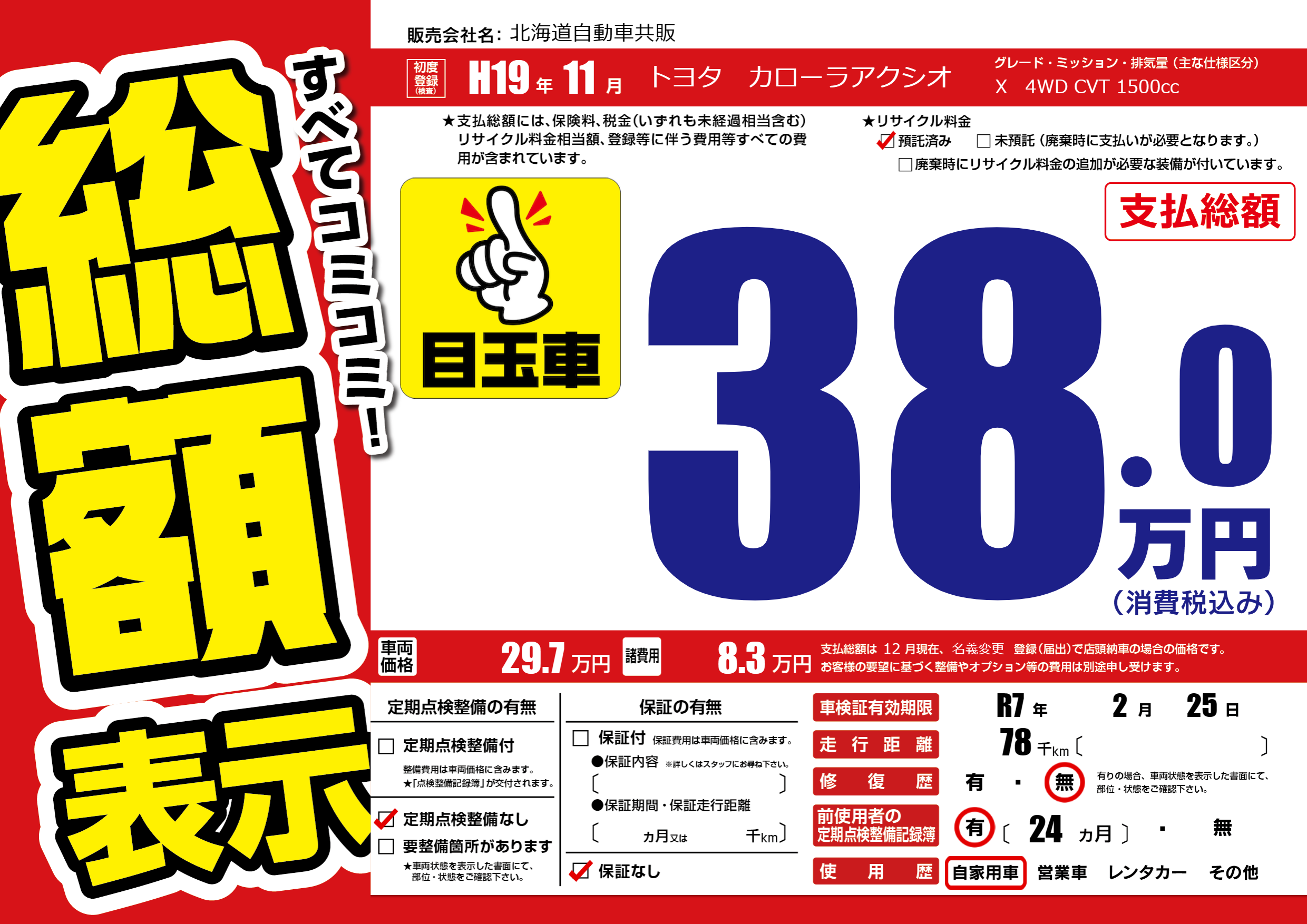 | 車名 | トヨタ カローラアクシオ | グレード ミッション 排気量 |