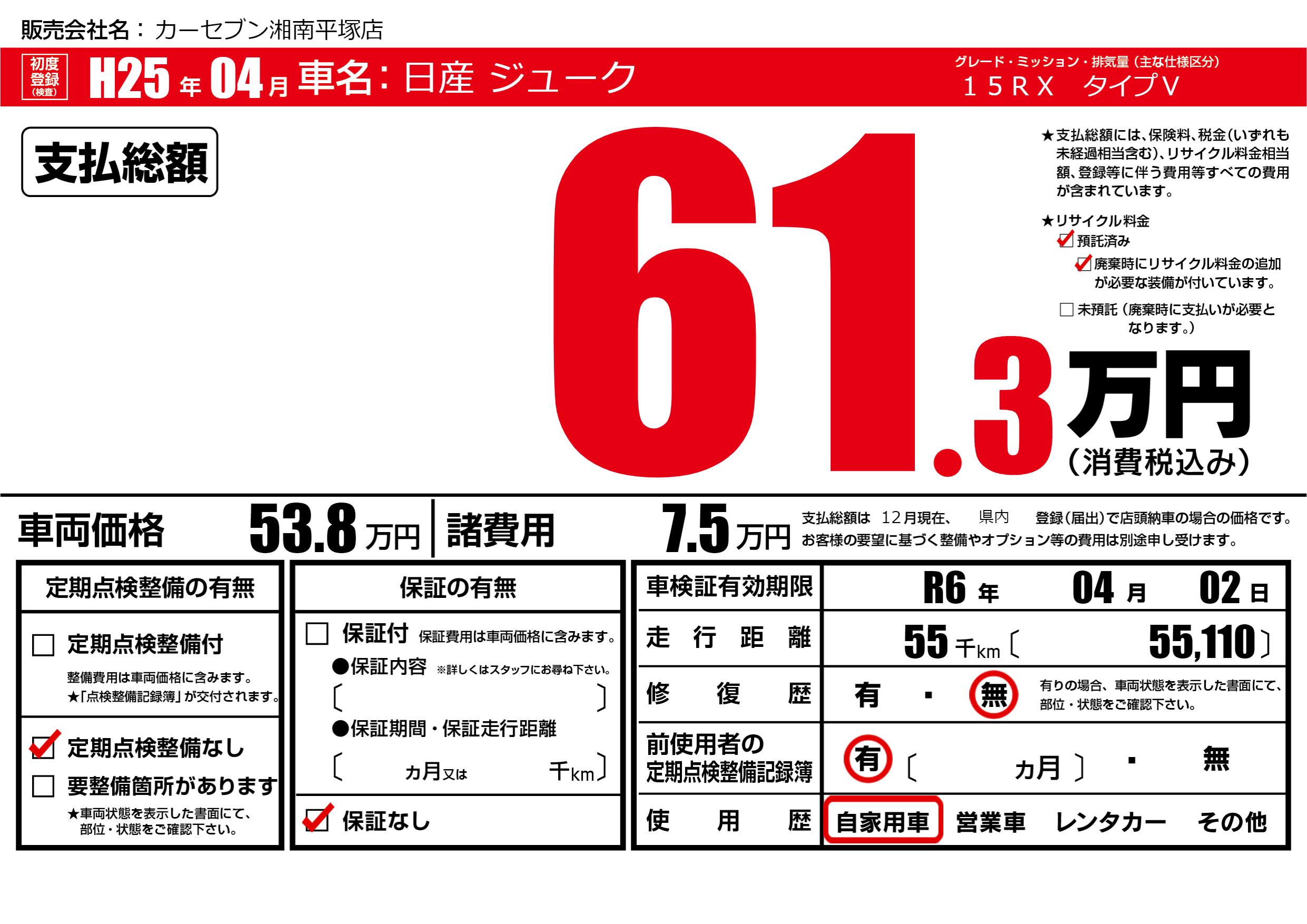 | 車名 | 日産 ジューク | グレード ミッション 排気量 |
