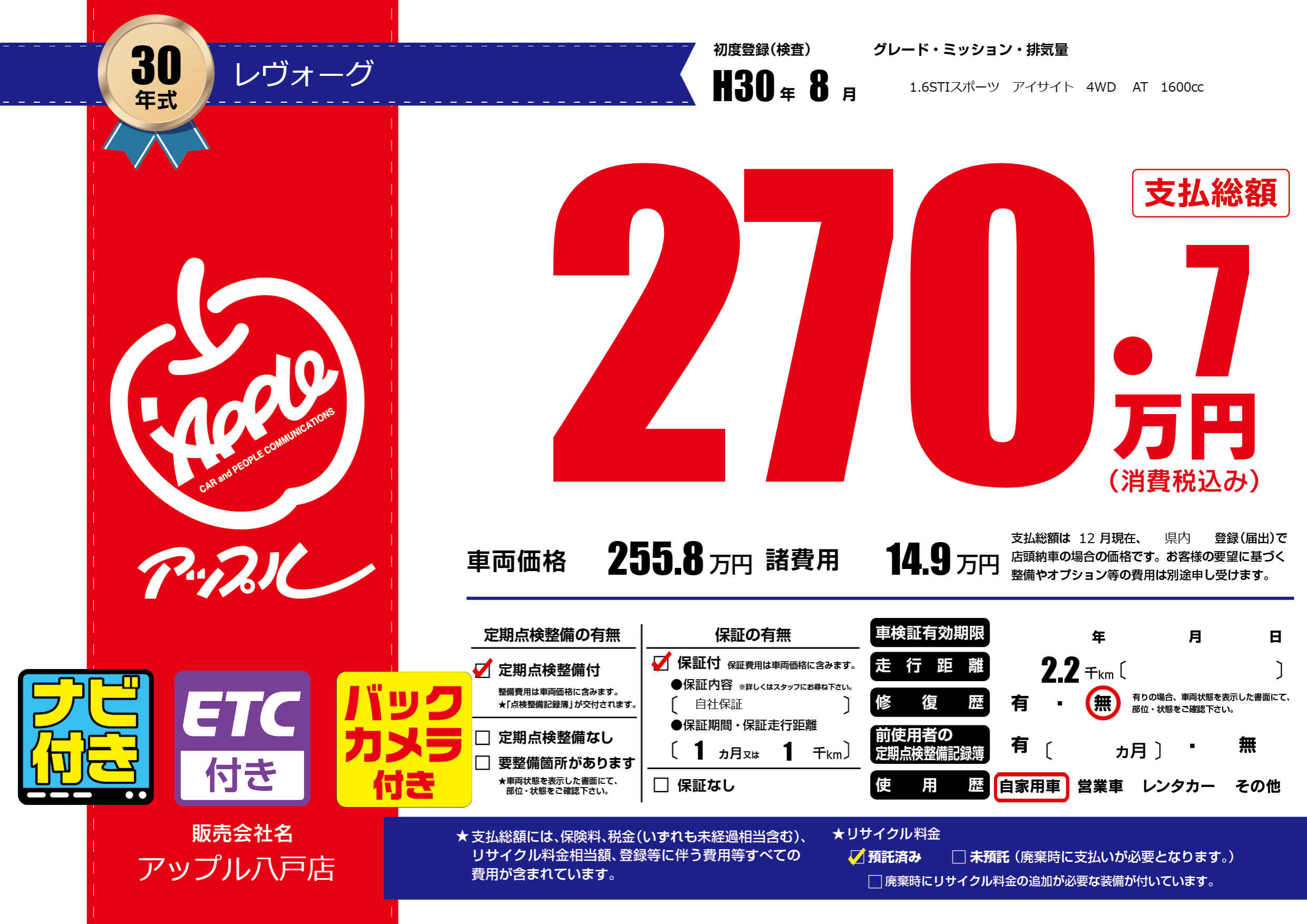 | 初年度登録 | H30年8月 | ||