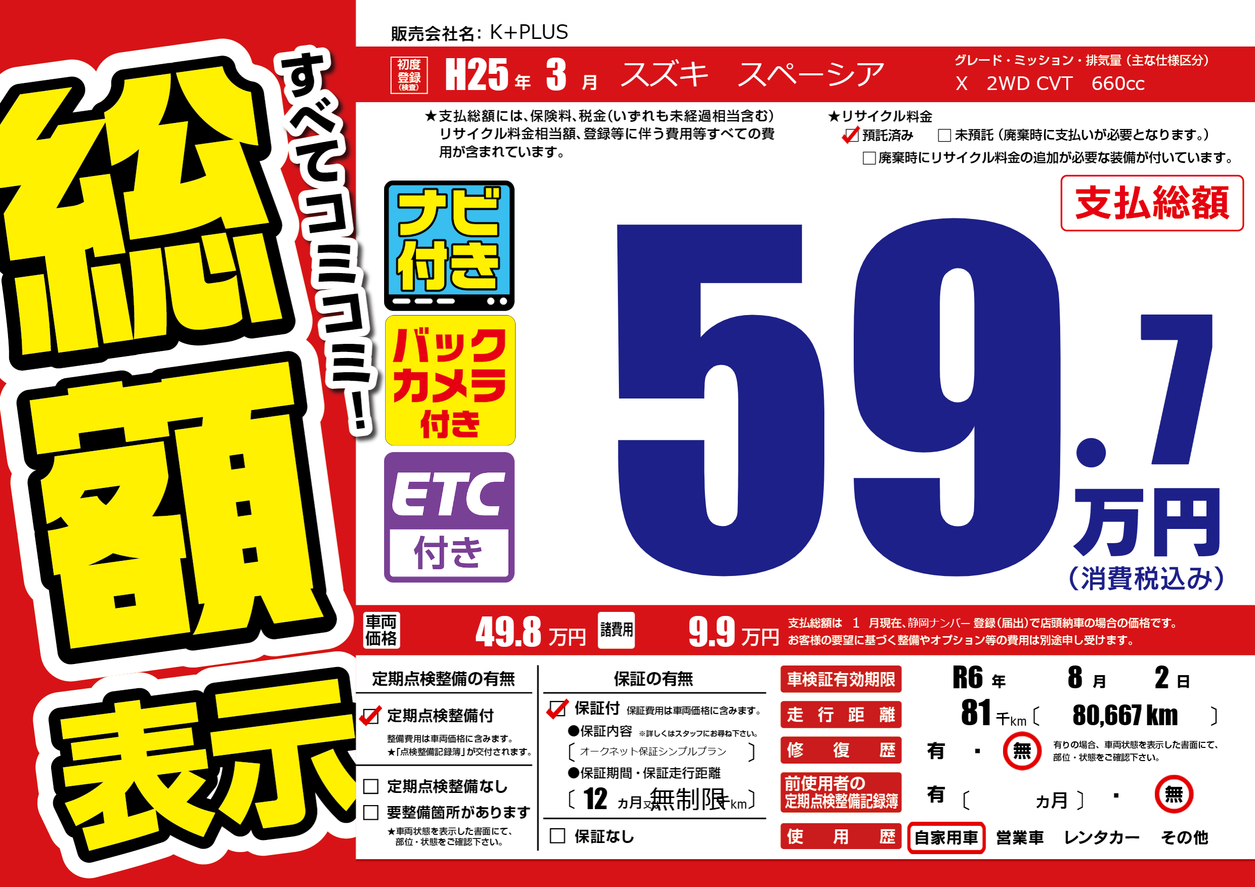 | 車名 | スズキ スペーシア | グレード ミッション 排気量 |