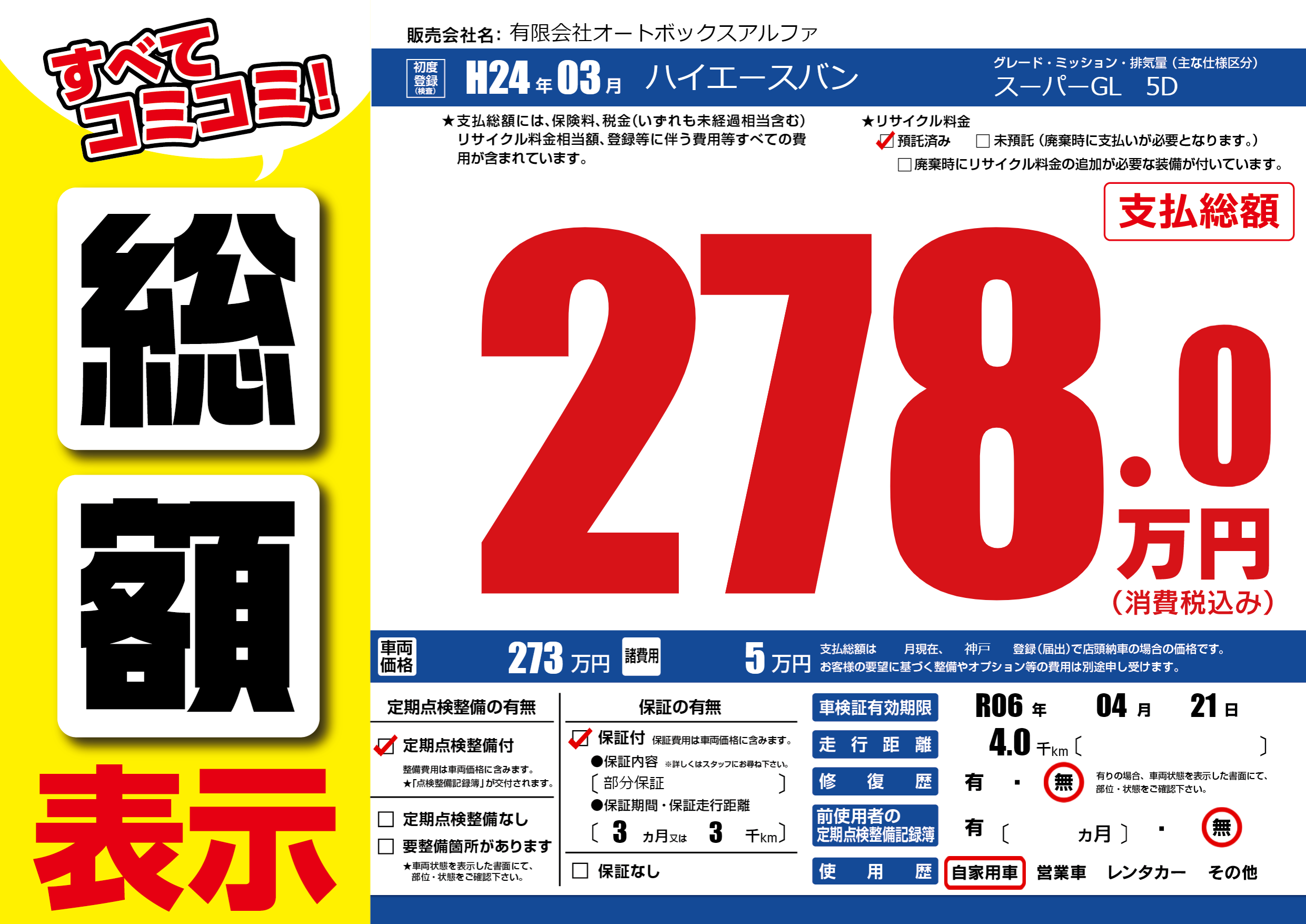 | 車名 | ハイエースバン | グレード ミッション 排気量 |