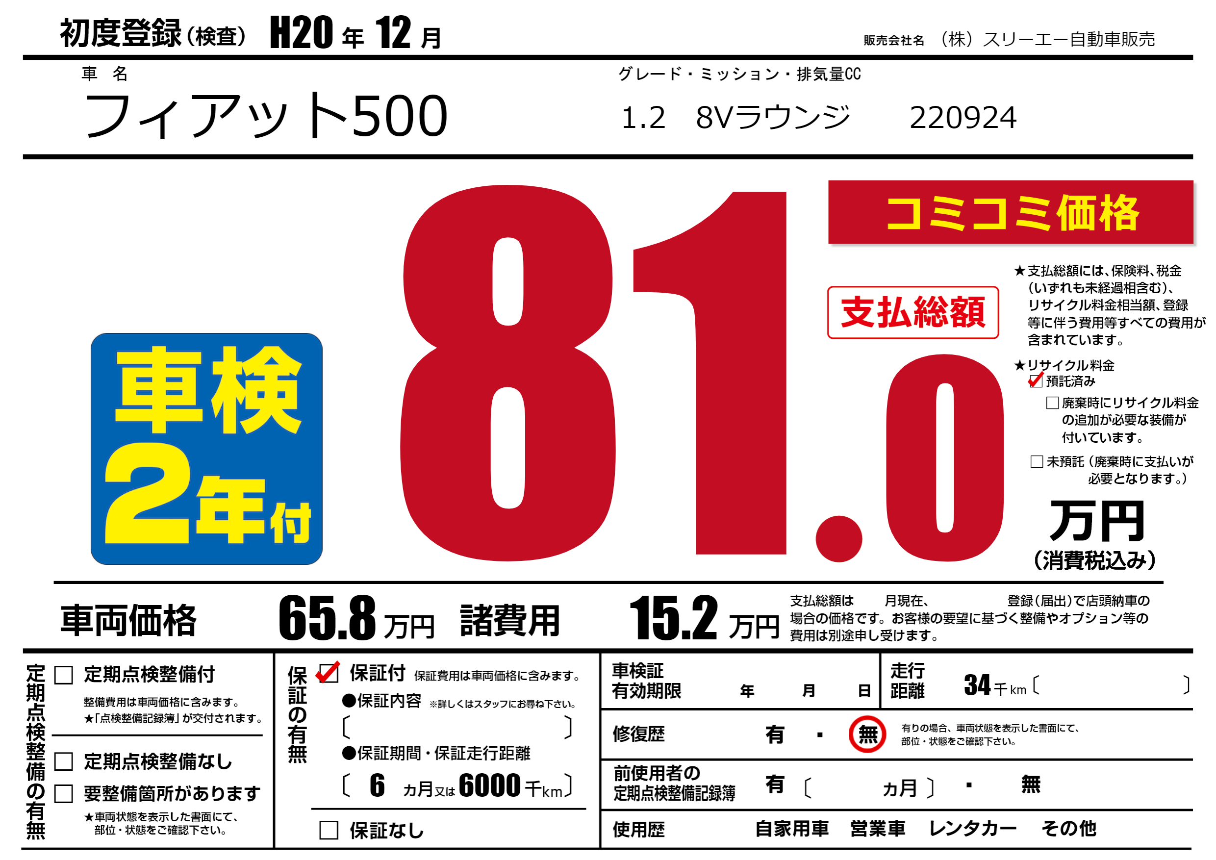 | 車名 | フィアット500 | グレード ミッション 排気量 |
