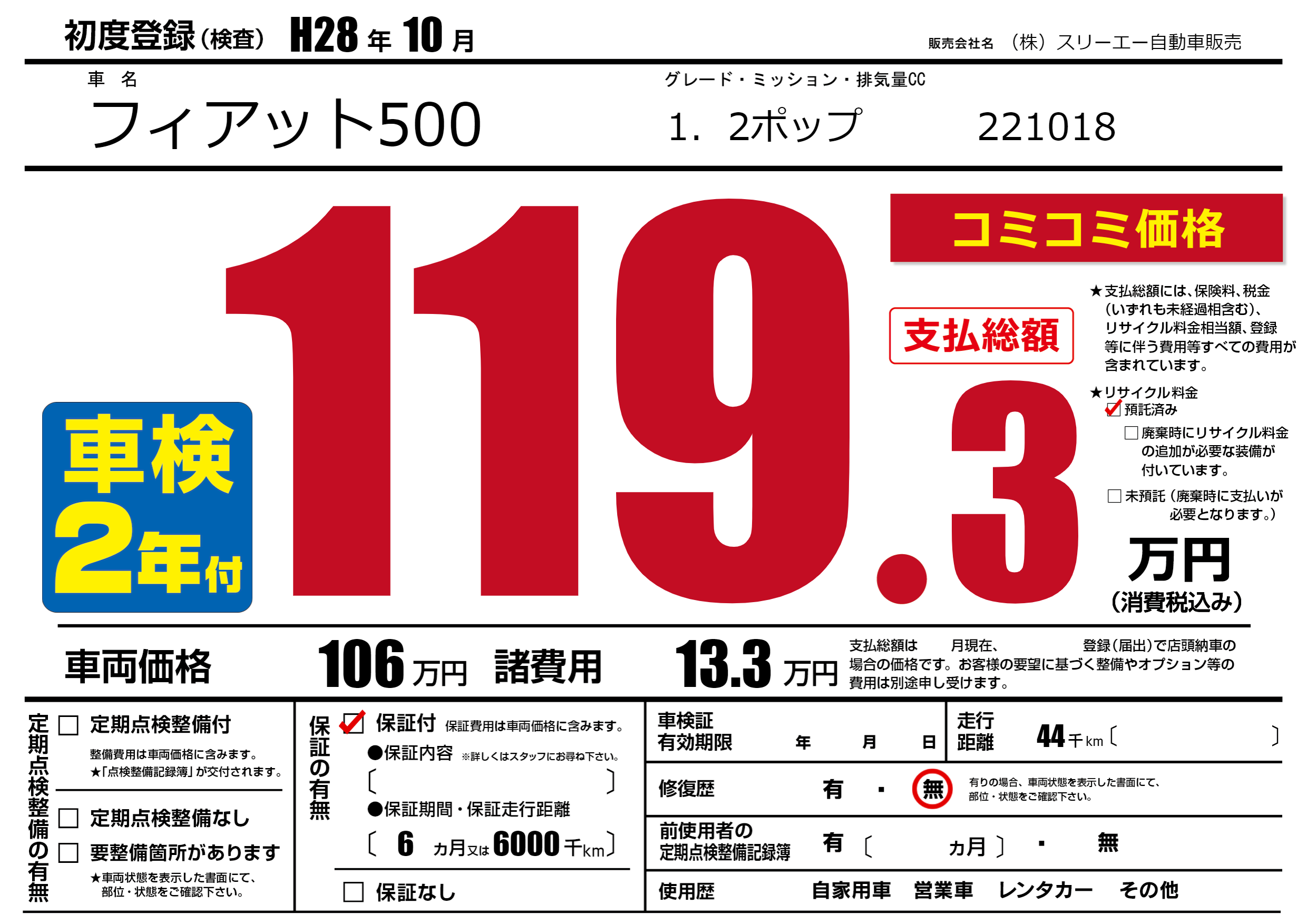 | 車名 | フィアット500 | グレード ミッション 排気量 |