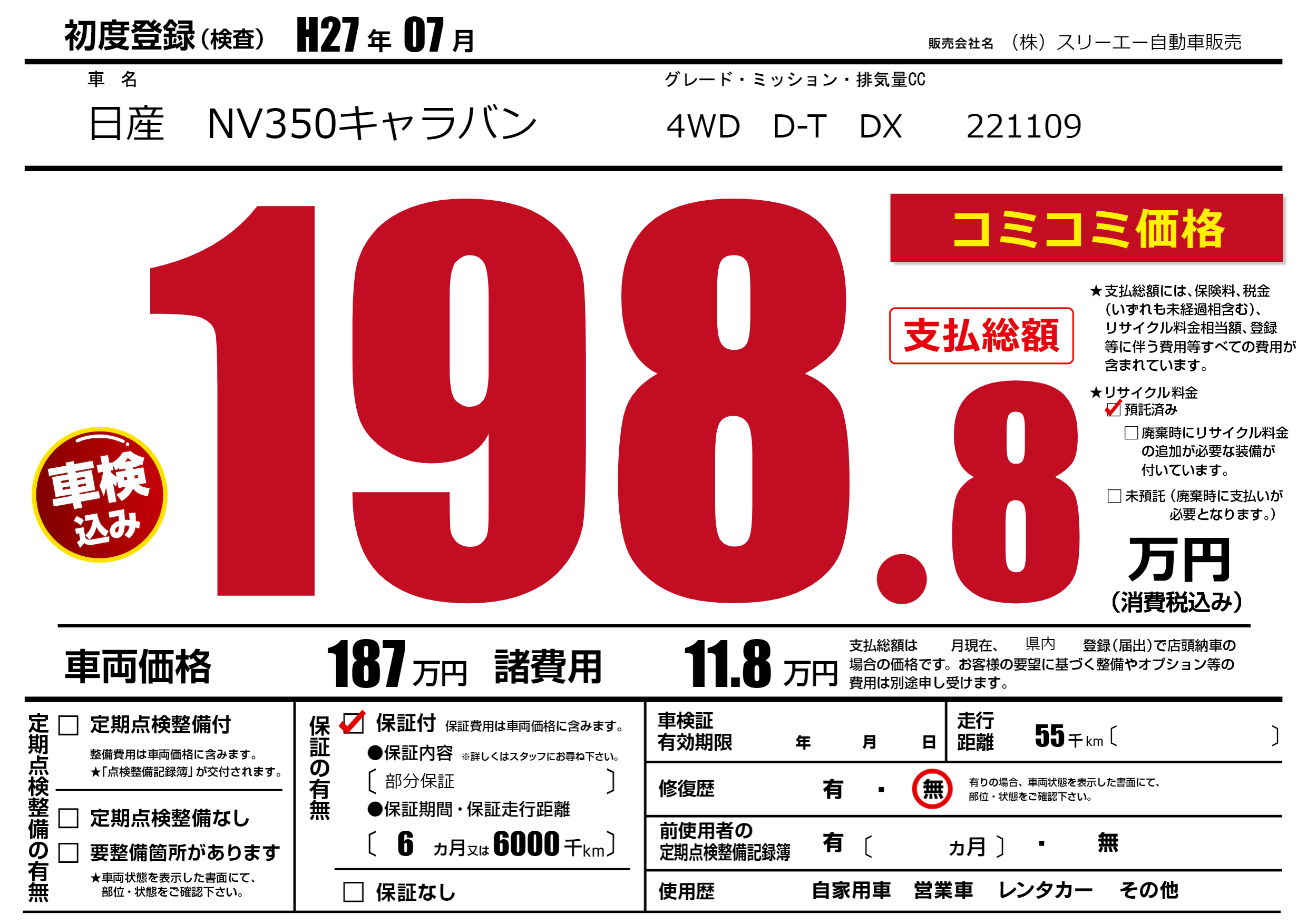 保証付き 保証内容(部分保証) 6ヶ月または(6000)千kmまで |