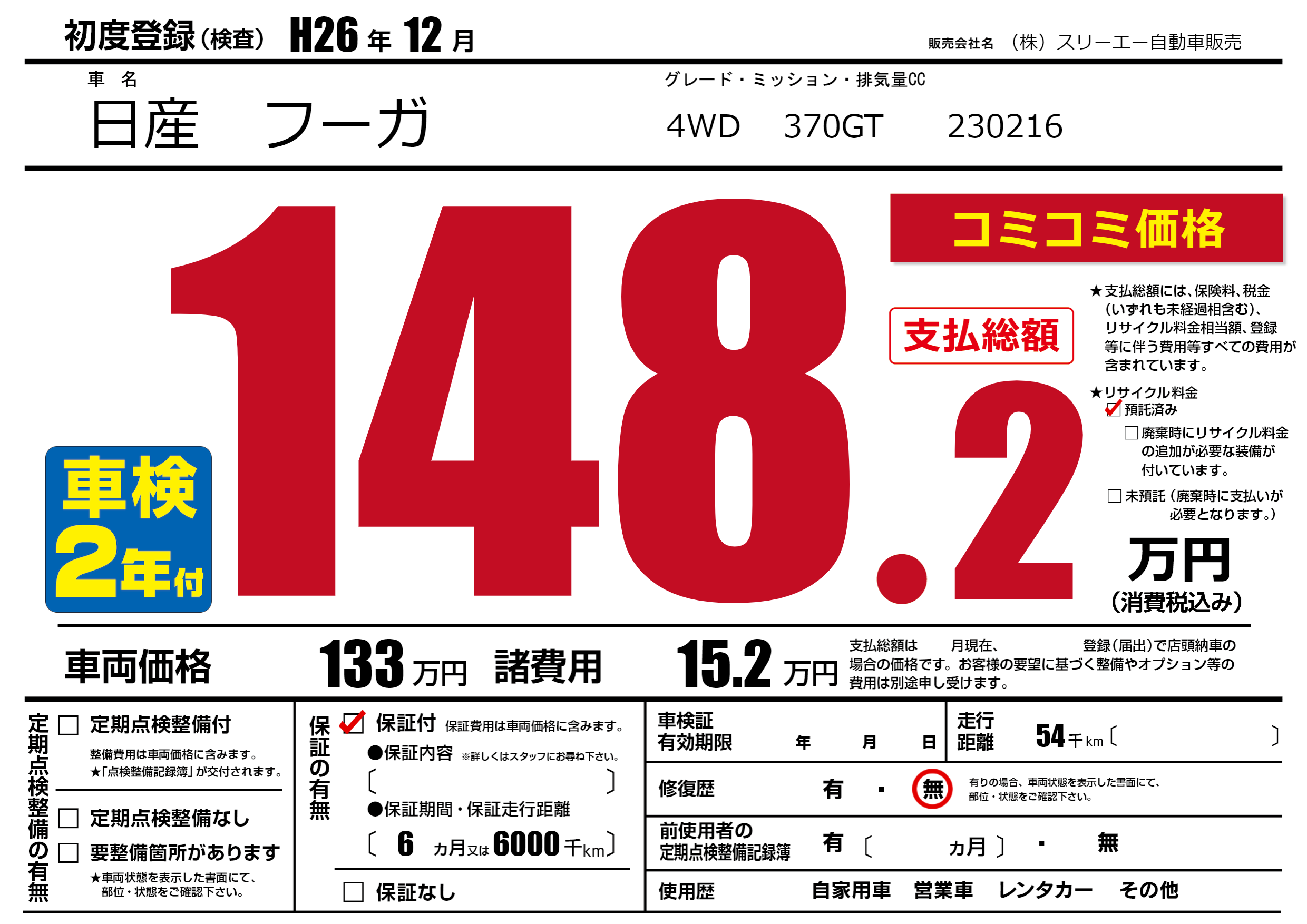 | 走行キロ | 5.4万km | 初年度登録 | H26年12月 |