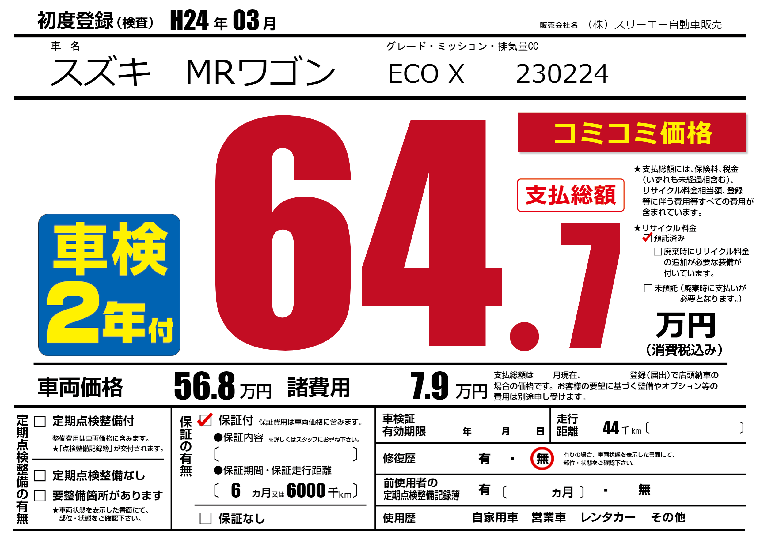 | 走行キロ | 4.4万km | 初年度登録 | H24年03月 |