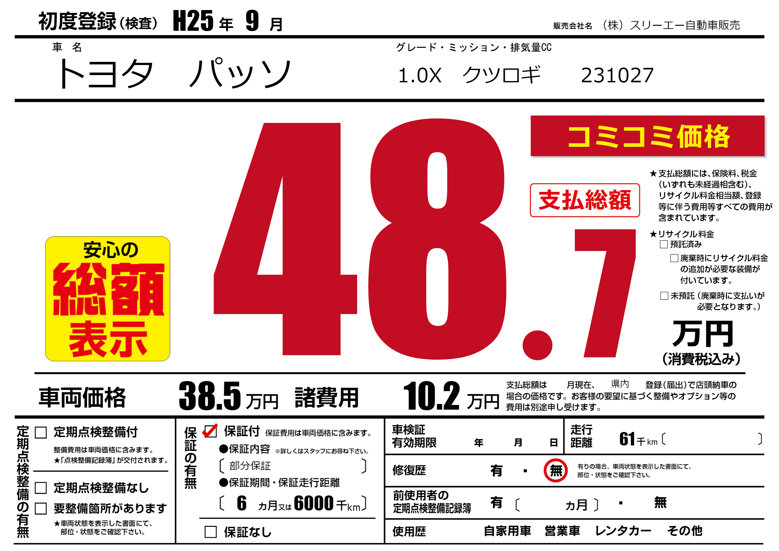 保証付き 保証内容(部分保証) 6ヶ月または(6000)千kmまで |