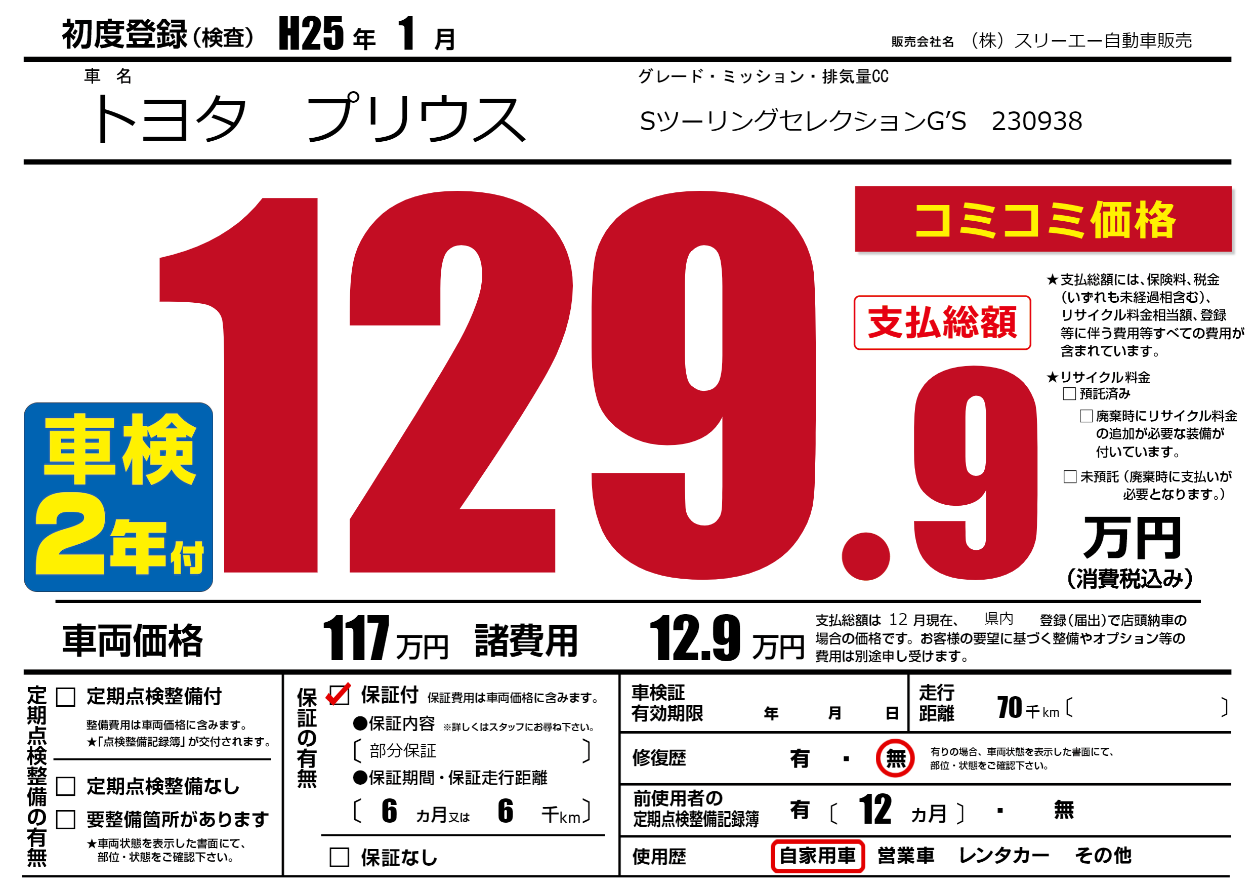 | 走行キロ | 7万km | 初年度登録 | H25年1月 |