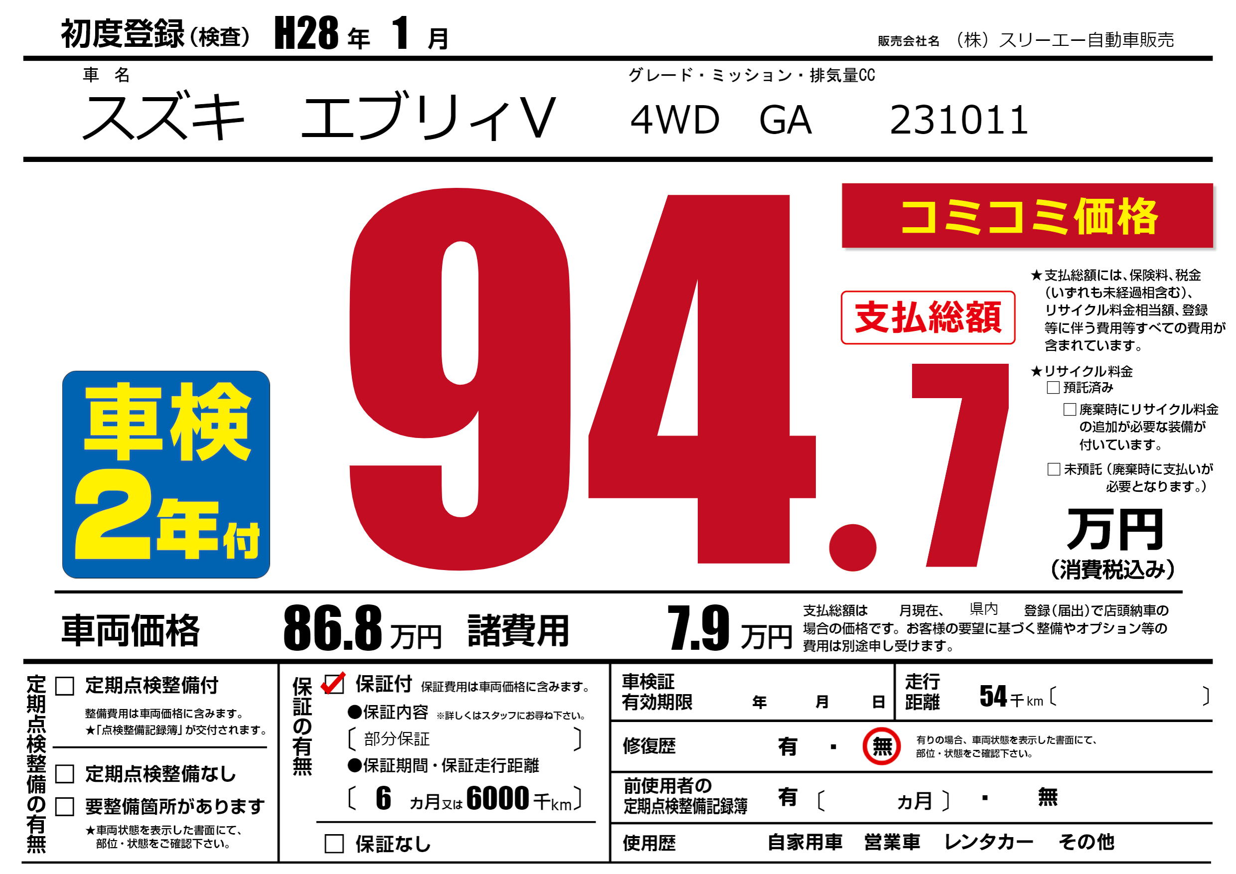 | 車名 | スズキ エブリィV | グレード ミッション 排気量 |