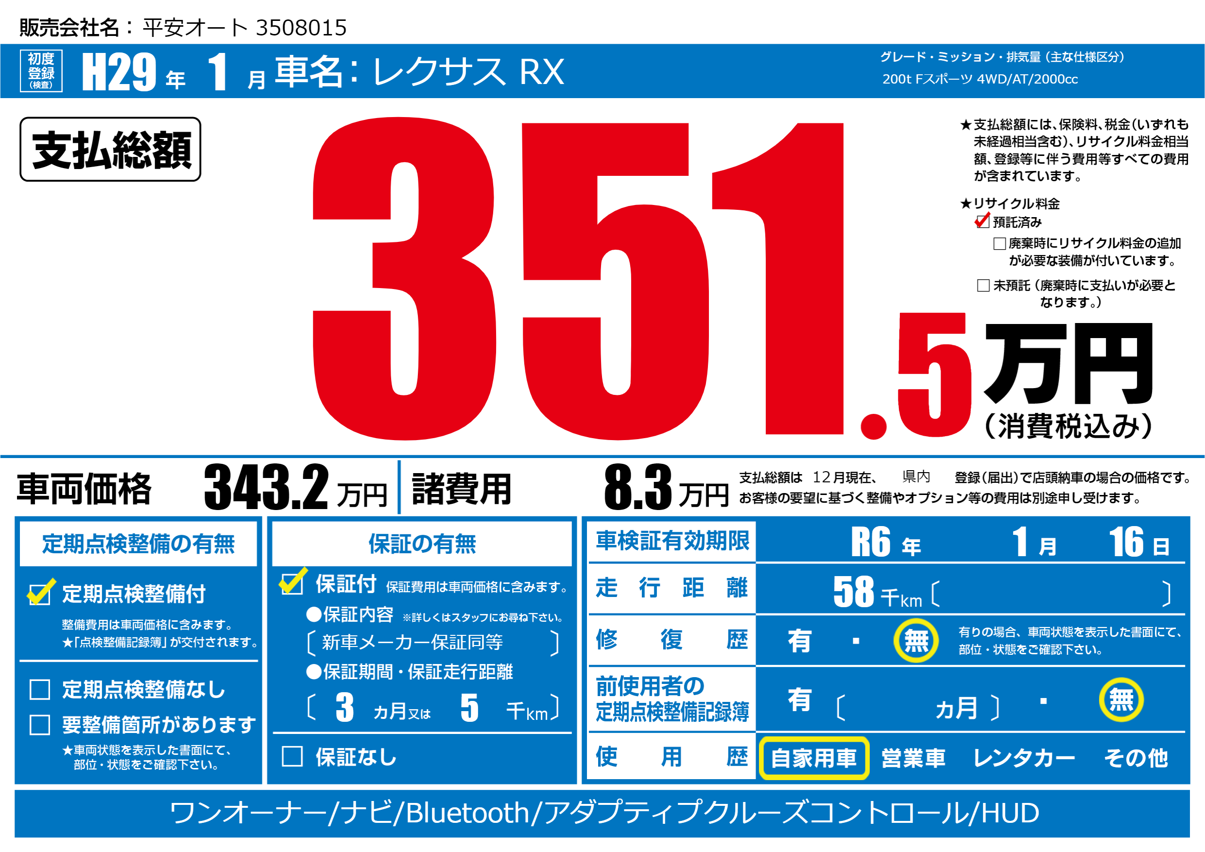 | 車名 | レクサス RX | グレード ミッション 排気量 |