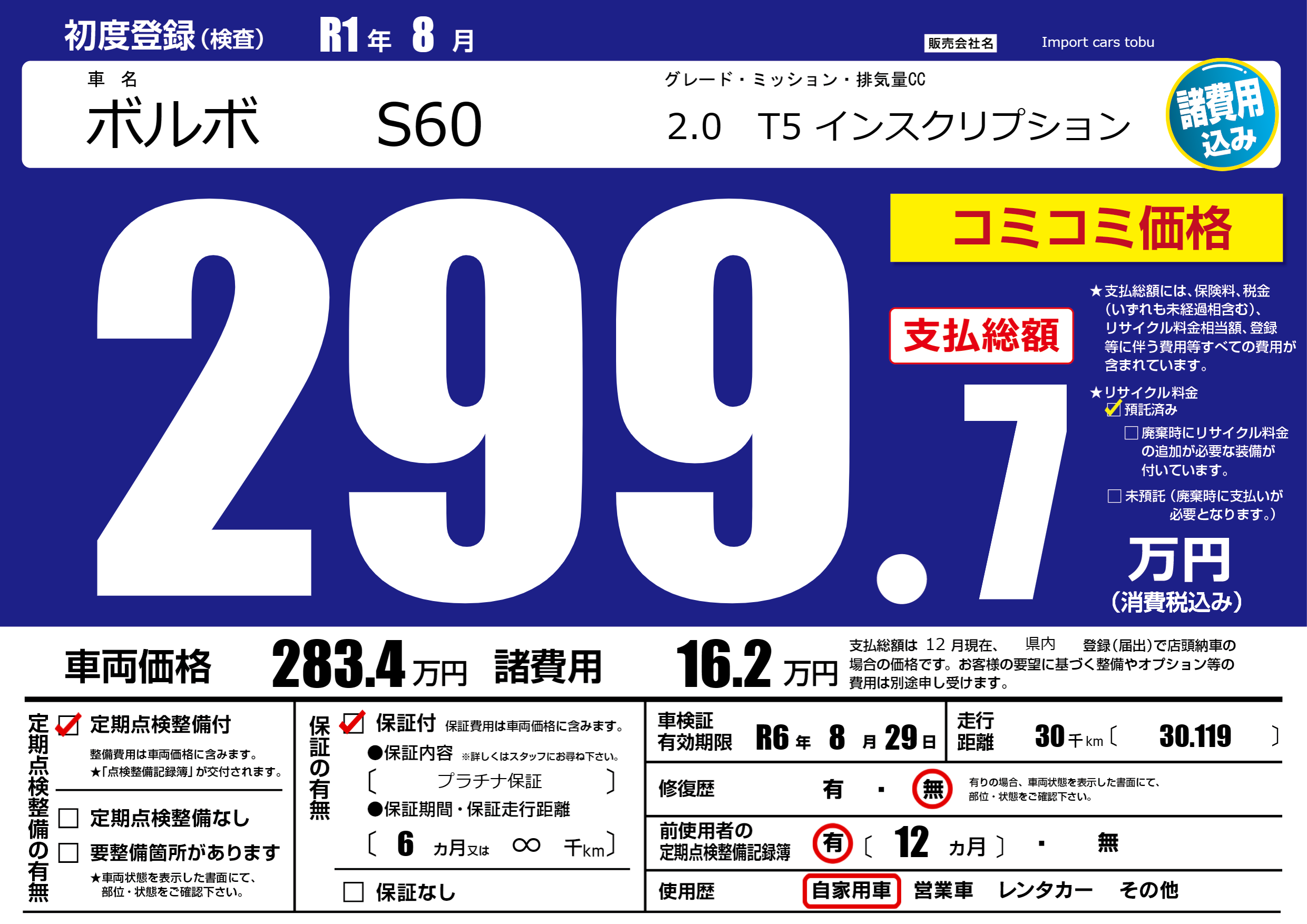 | 車名 | ボルボ S60 | グレード ミッション 排気量 |