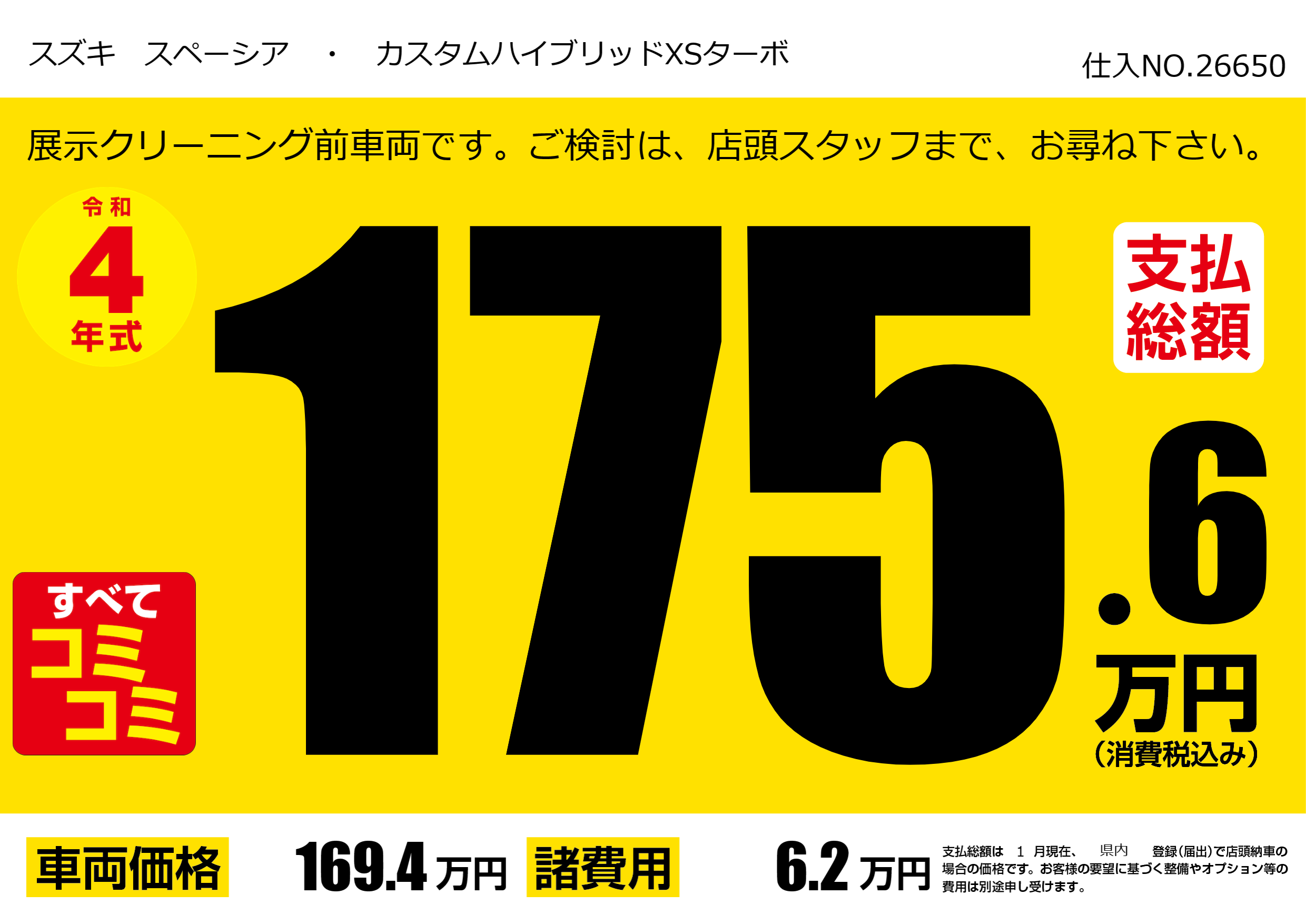 | 車名 | スズキ スペーシア ・ カスタムハイブリッドXSターボ | グレード ミッション 排気量 |