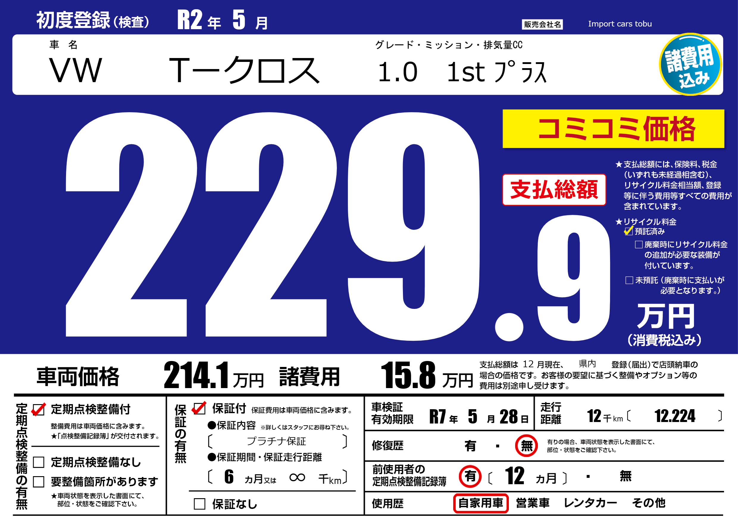 | 車名 | VW Tークロス | グレード ミッション 排気量 |