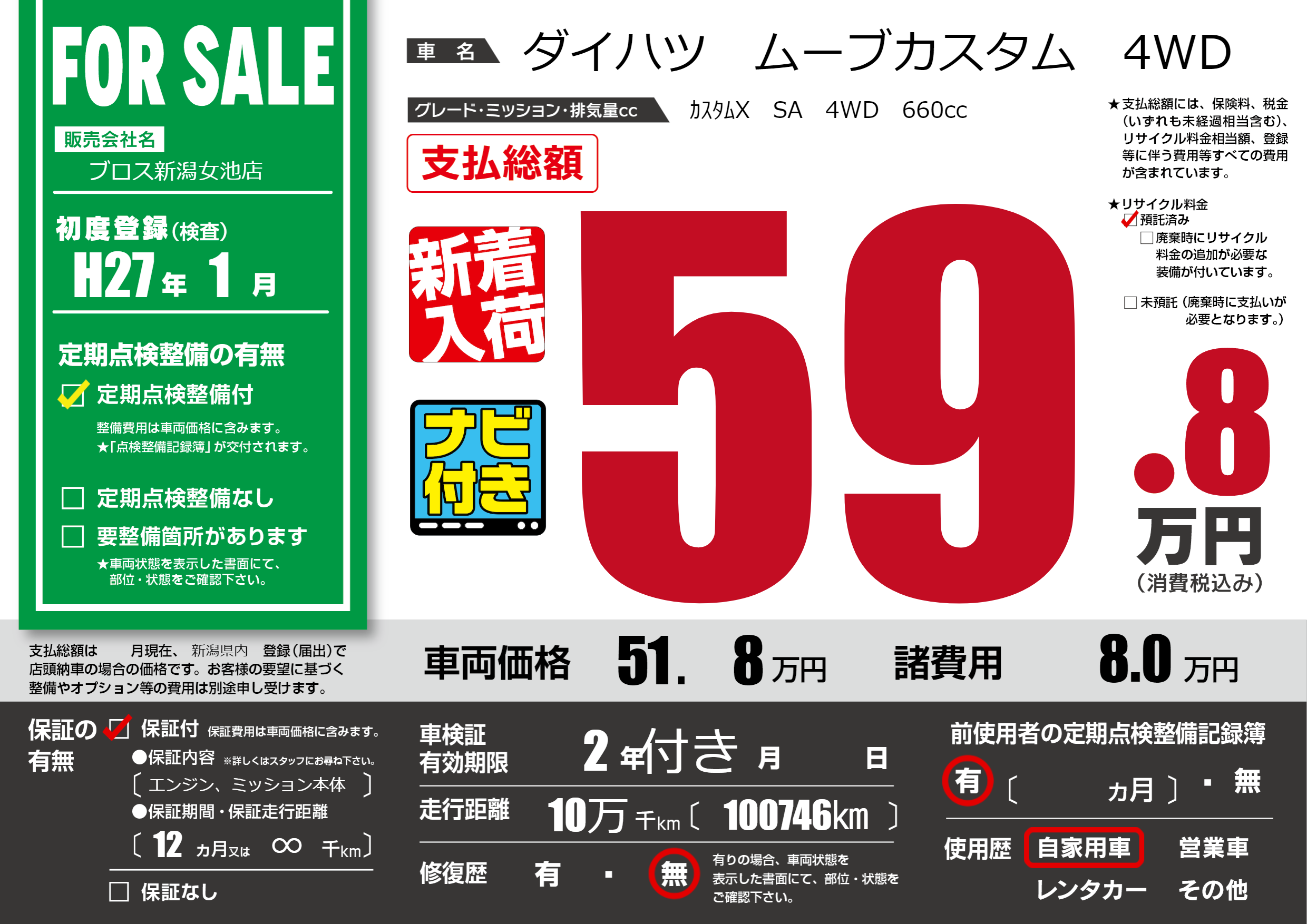| 走行キロ | 1万km | 初年度登録 | H27年1月 |