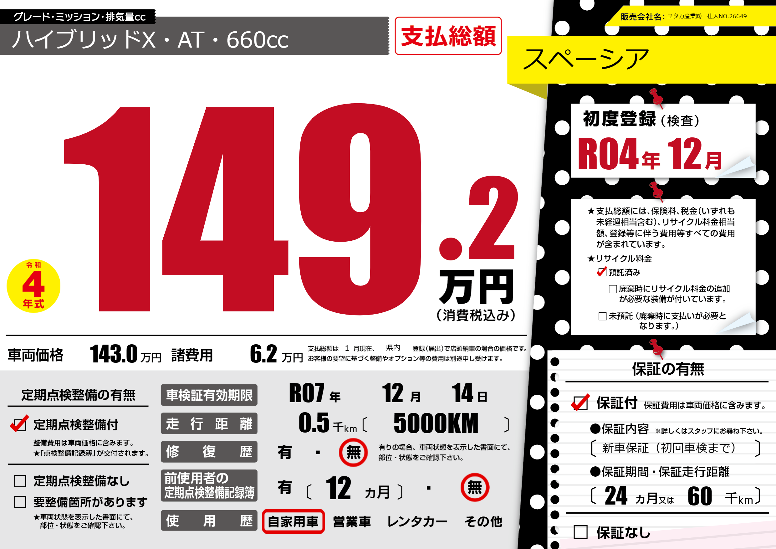 | 車名 | スペーシア | グレード ミッション 排気量 |