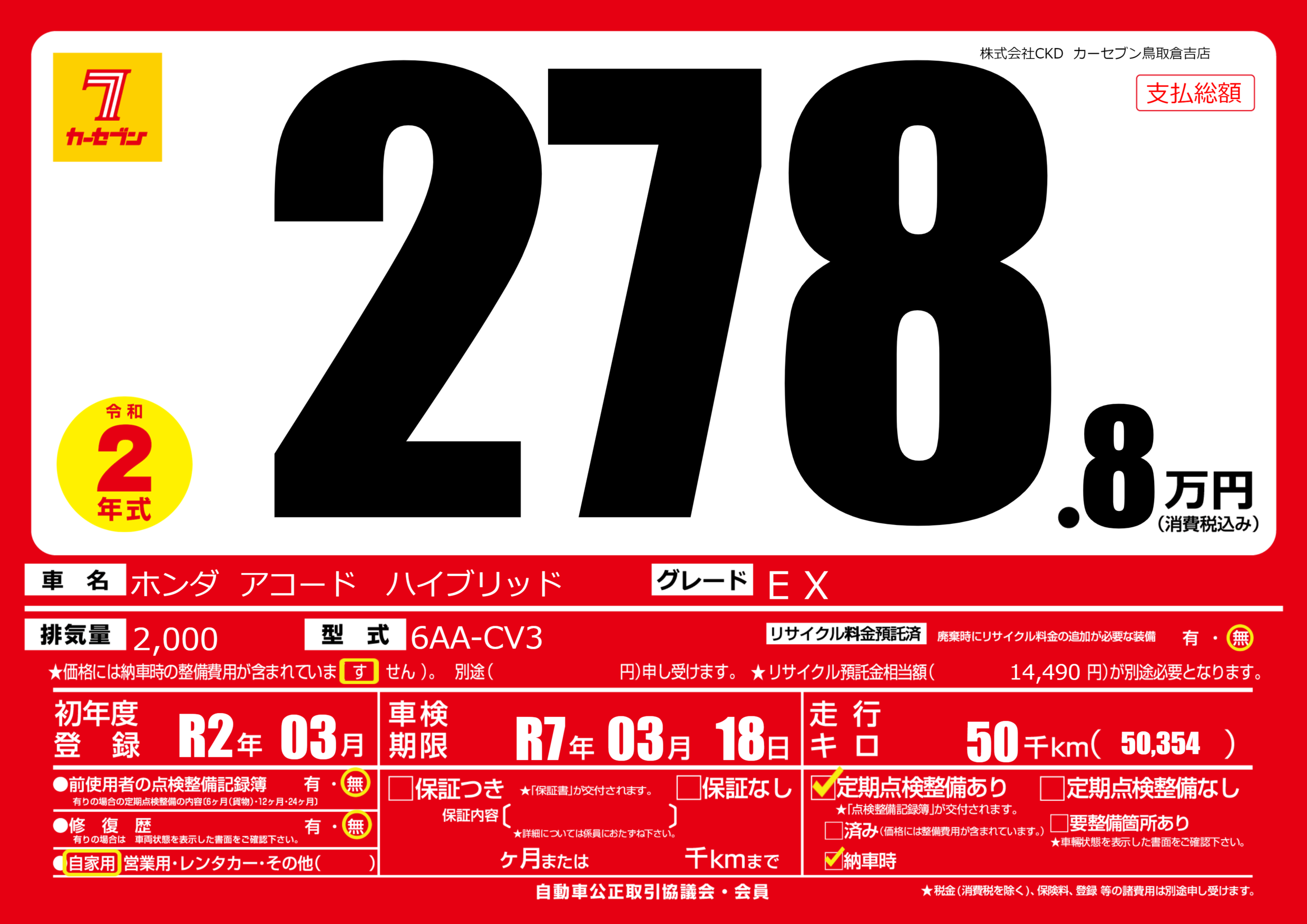 | 走行キロ | 5万km | 初年度登録 | R2年03月 |