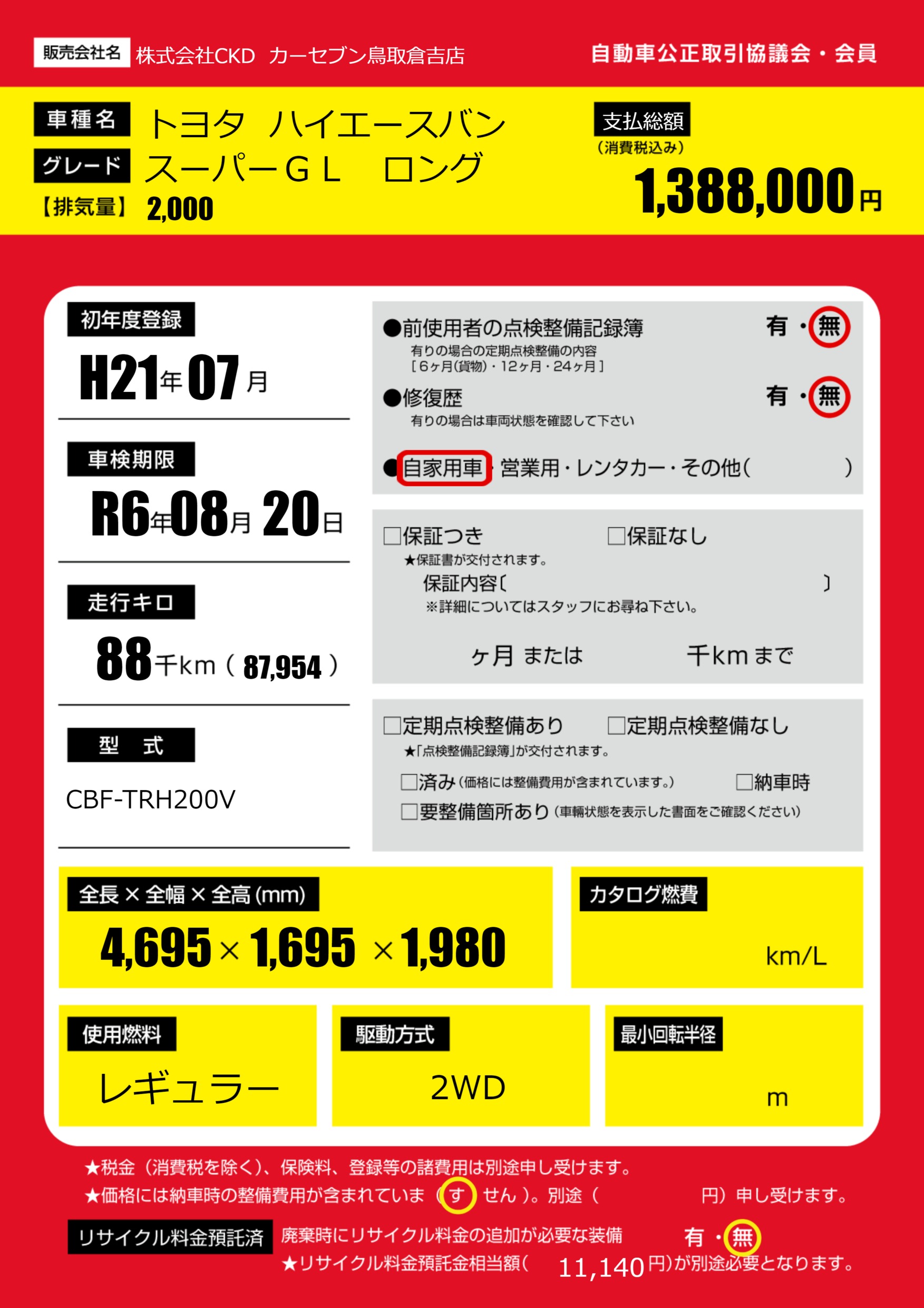 | 走行キロ | 8.8万km | 初年度登録 | H21年07月 |