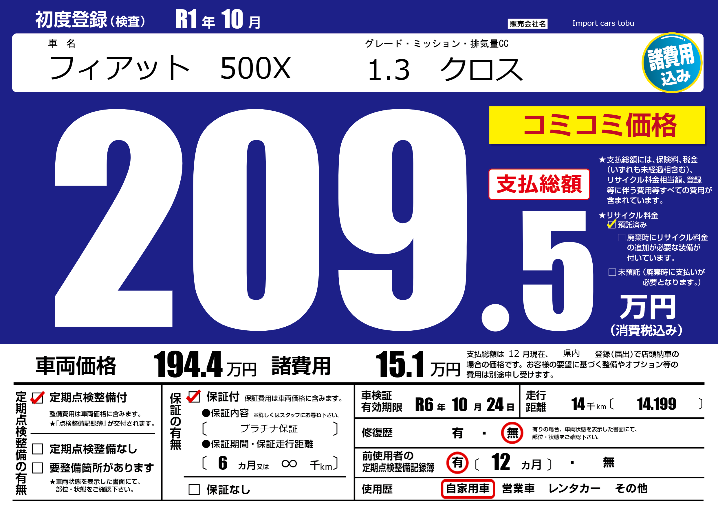 保証付き 保証内容( プラチナ保証) 6ヶ月または(∞)千kmまで |