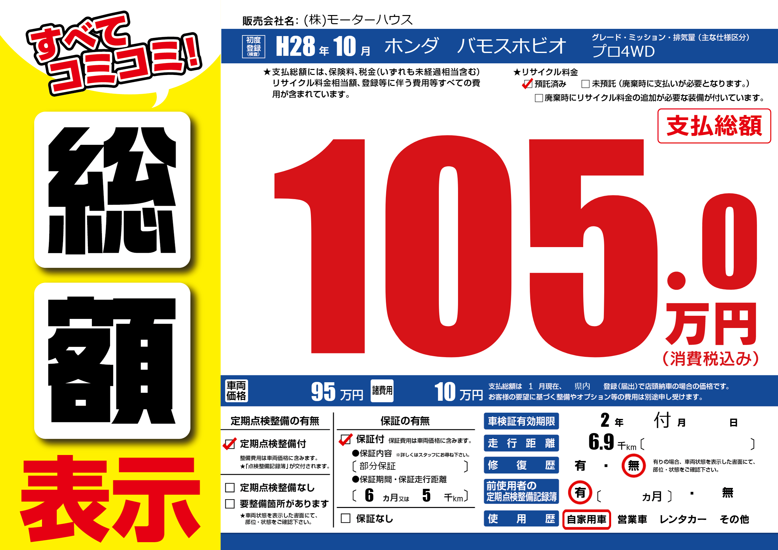 | 車名 | ホンダ バモスホビオ | グレード ミッション 排気量 |