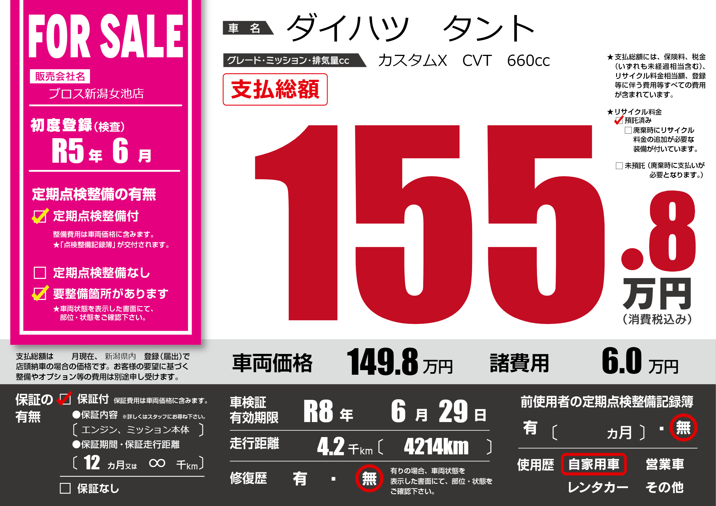 | 車名 | ダイハツ タント | グレード ミッション 排気量 |