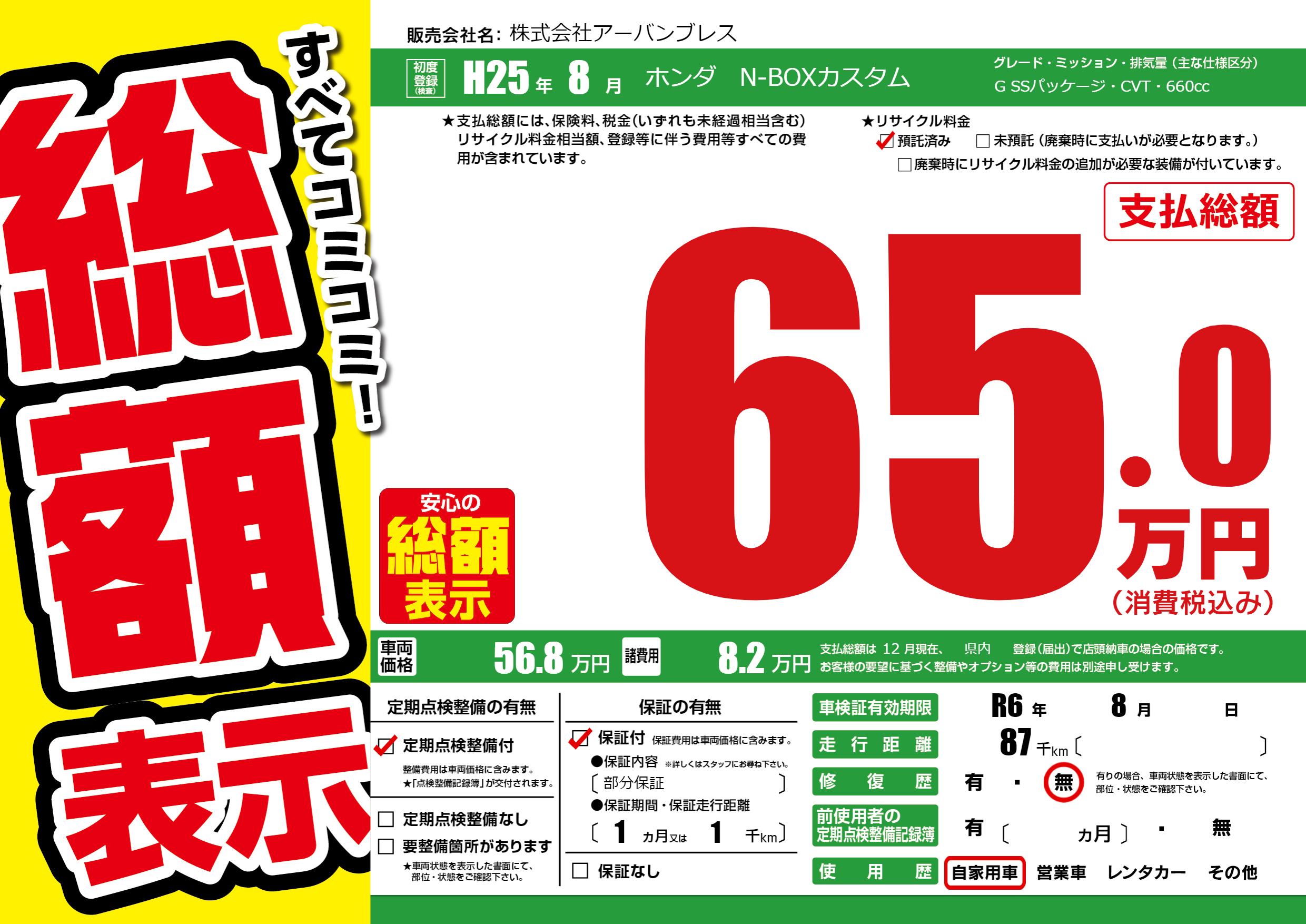 | 車名 | ホンダ N-BOXカスタム | グレード ミッション 排気量 |