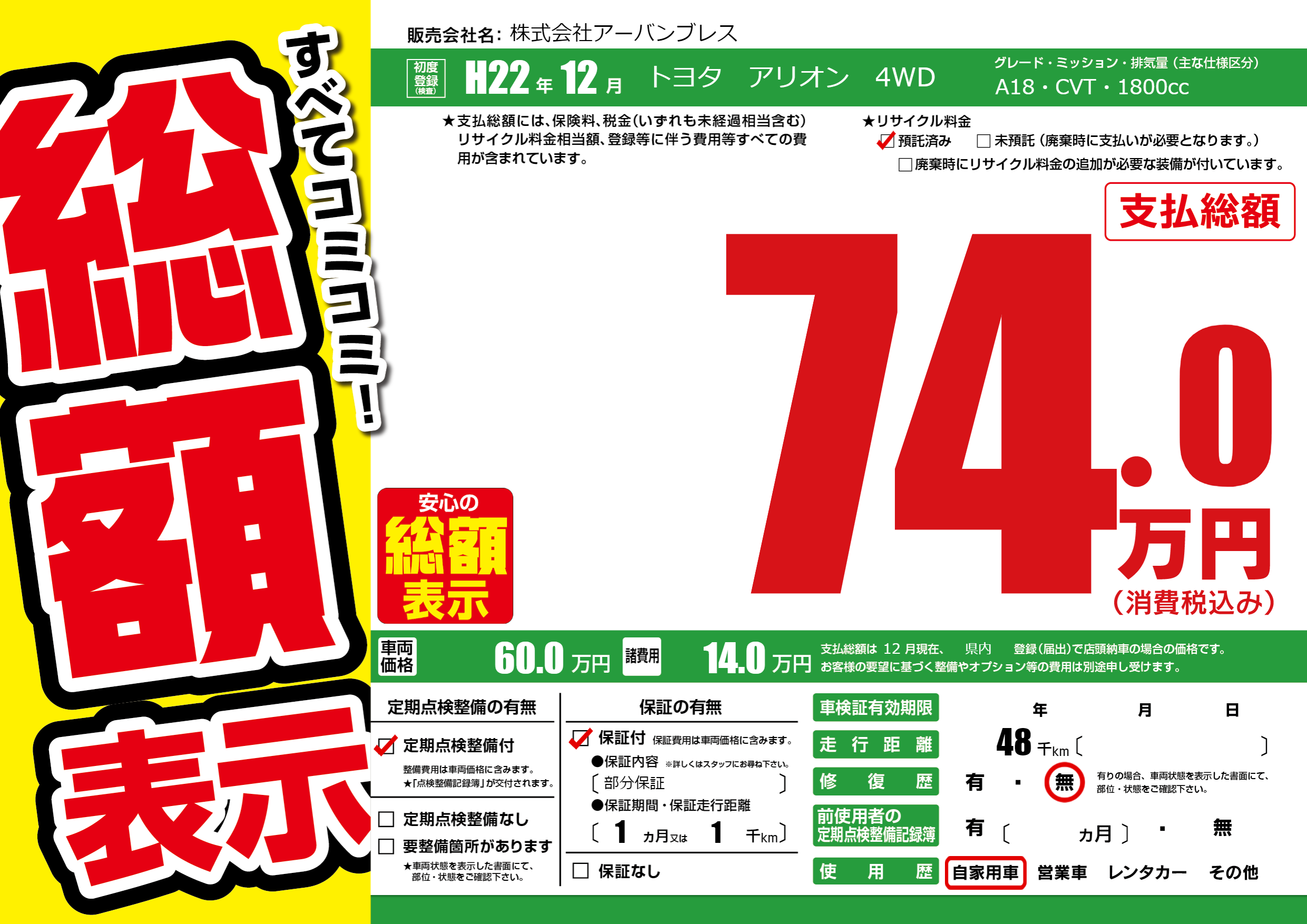 | 車名 | トヨタ アリオン 4WD | グレード ミッション 排気量 |