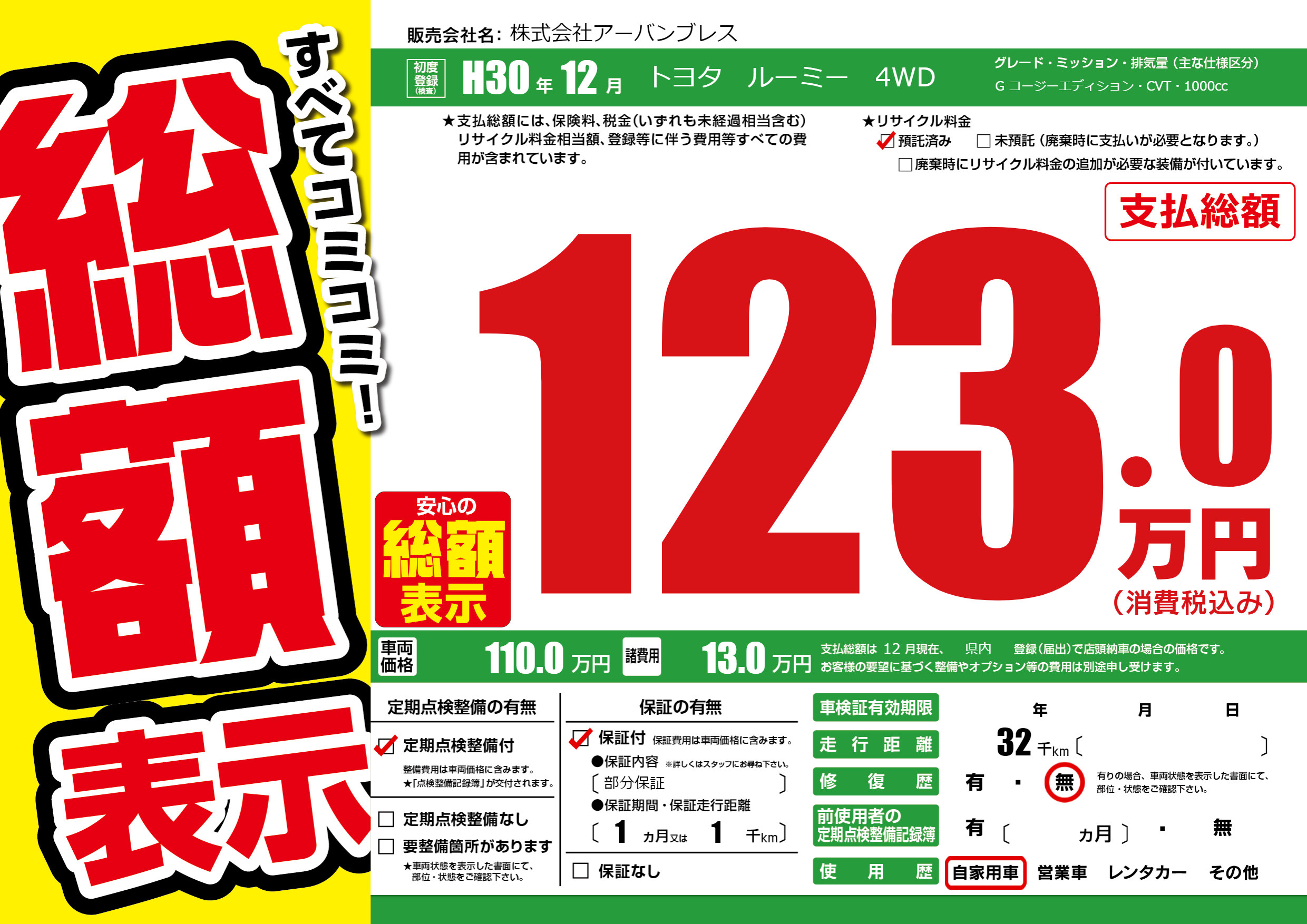 | 車名 | トヨタ ルーミー 4WD | グレード ミッション 排気量 |