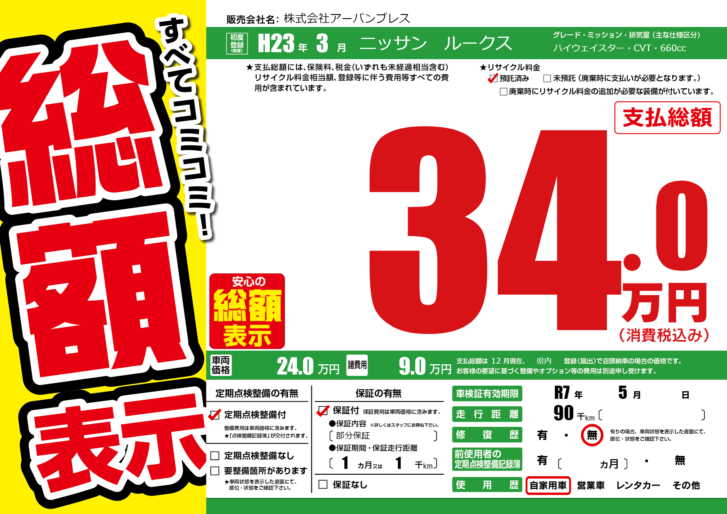 | 走行キロ | 9万km | 初年度登録 | H23年3月 |