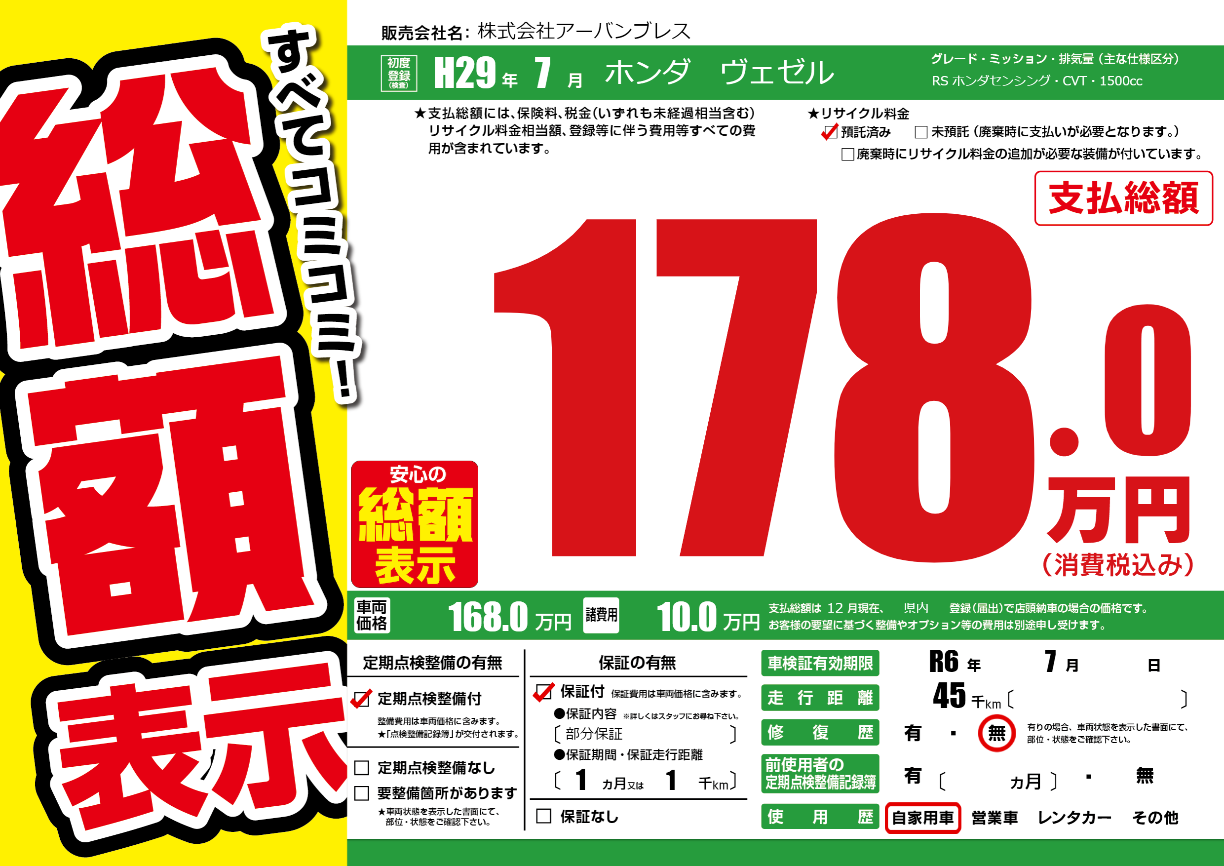 | 車名 | ホンダ ヴェゼル | グレード ミッション 排気量 |