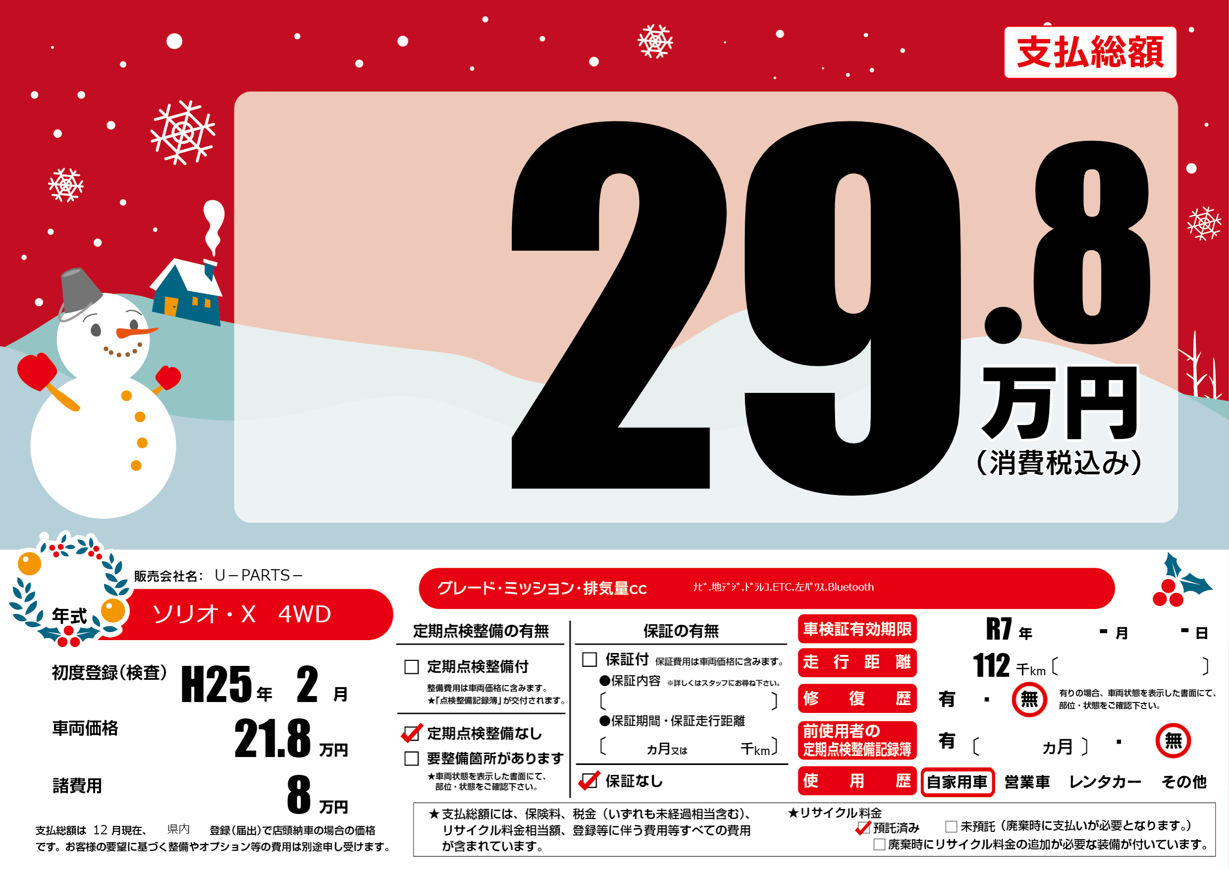 | 車名 | ソリオ・X 4WD | グレード ミッション 排気量 |
