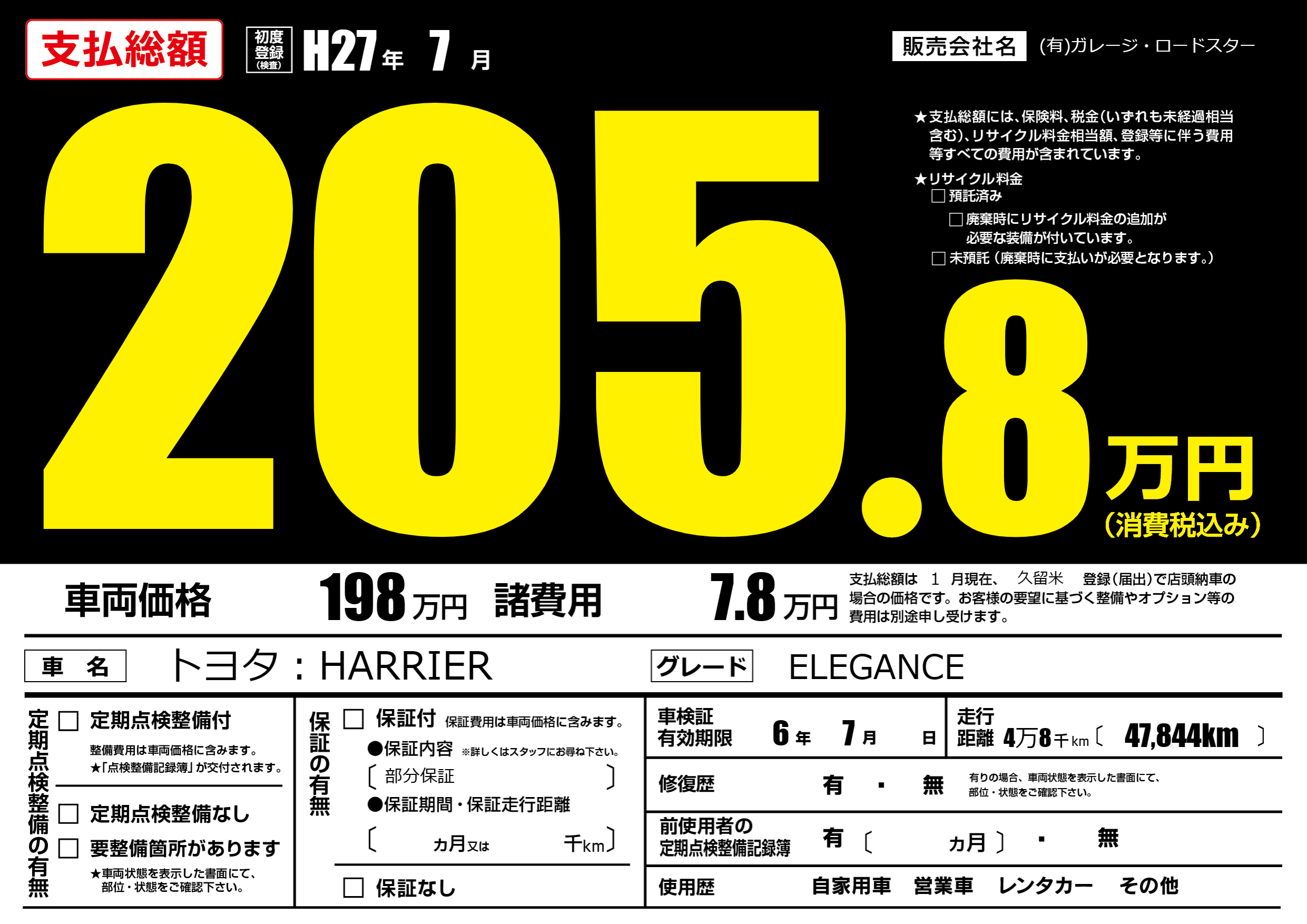 | 車名 | トヨタ:HARRIER | グレード ミッション 排気量 |
