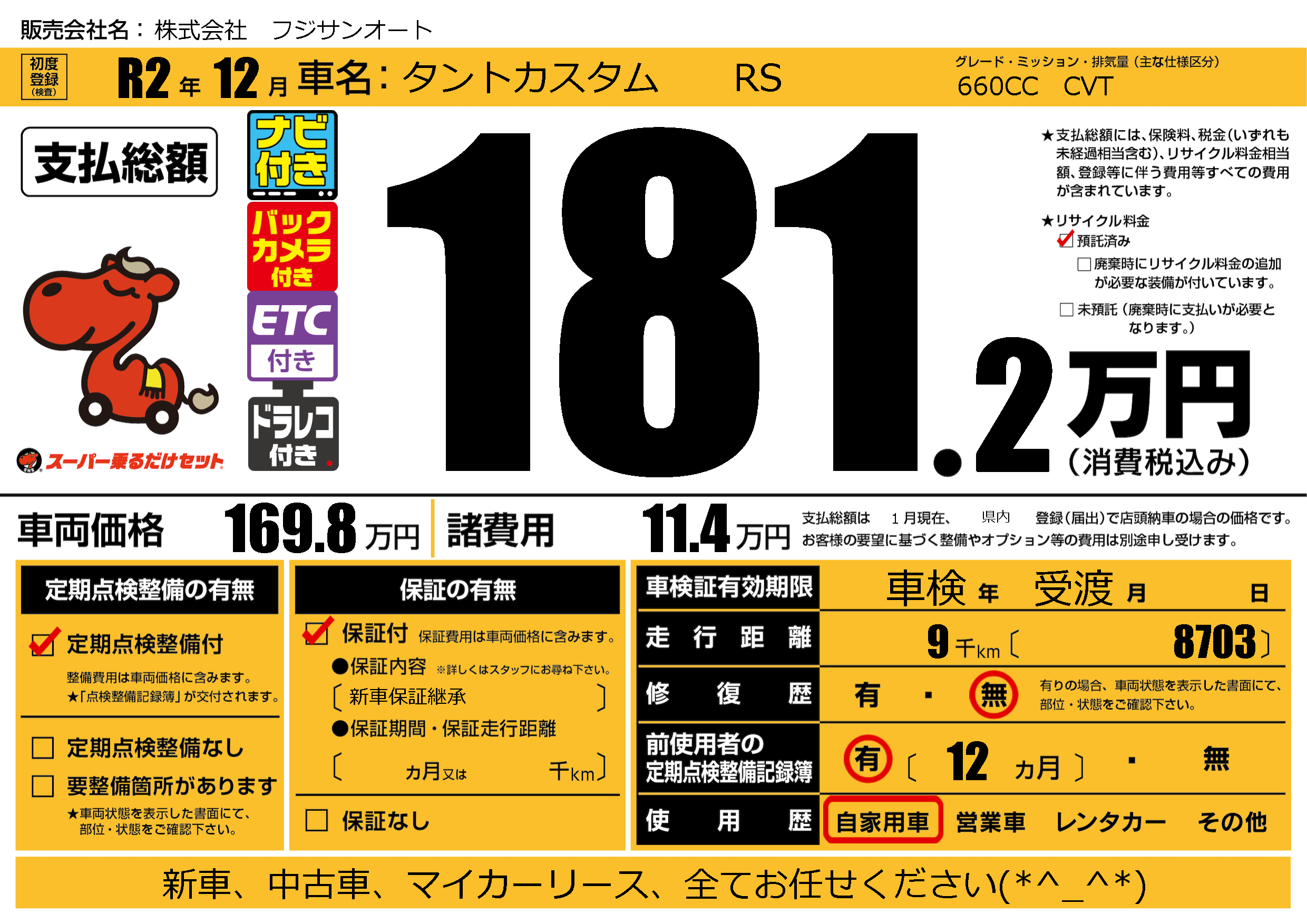 | 車名 | タントカスタム RS | グレード ミッション 排気量 |