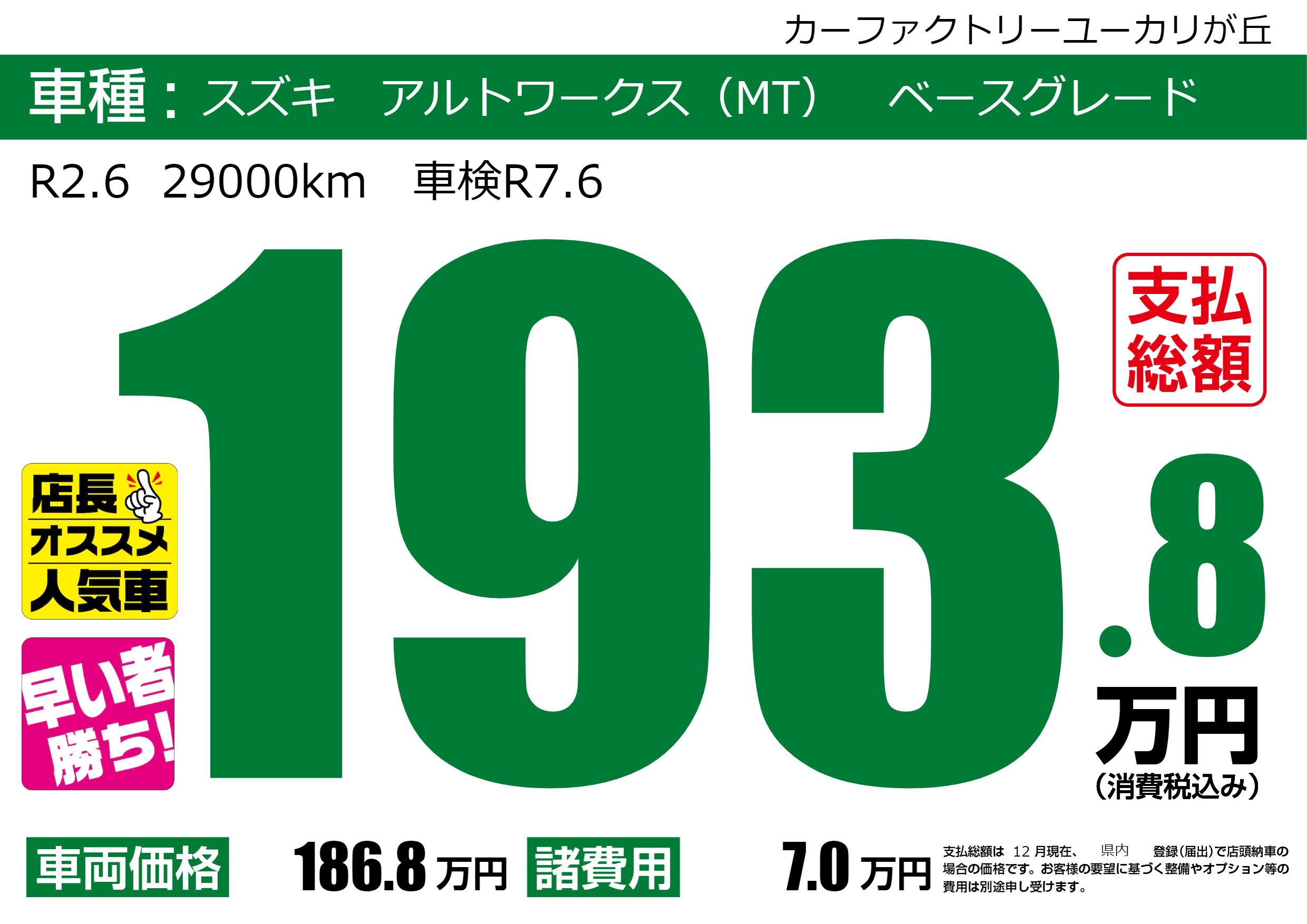 | 車名 | スズキ アルトワークス(MT) ベースグレード | グレード ミッション 排気量 |