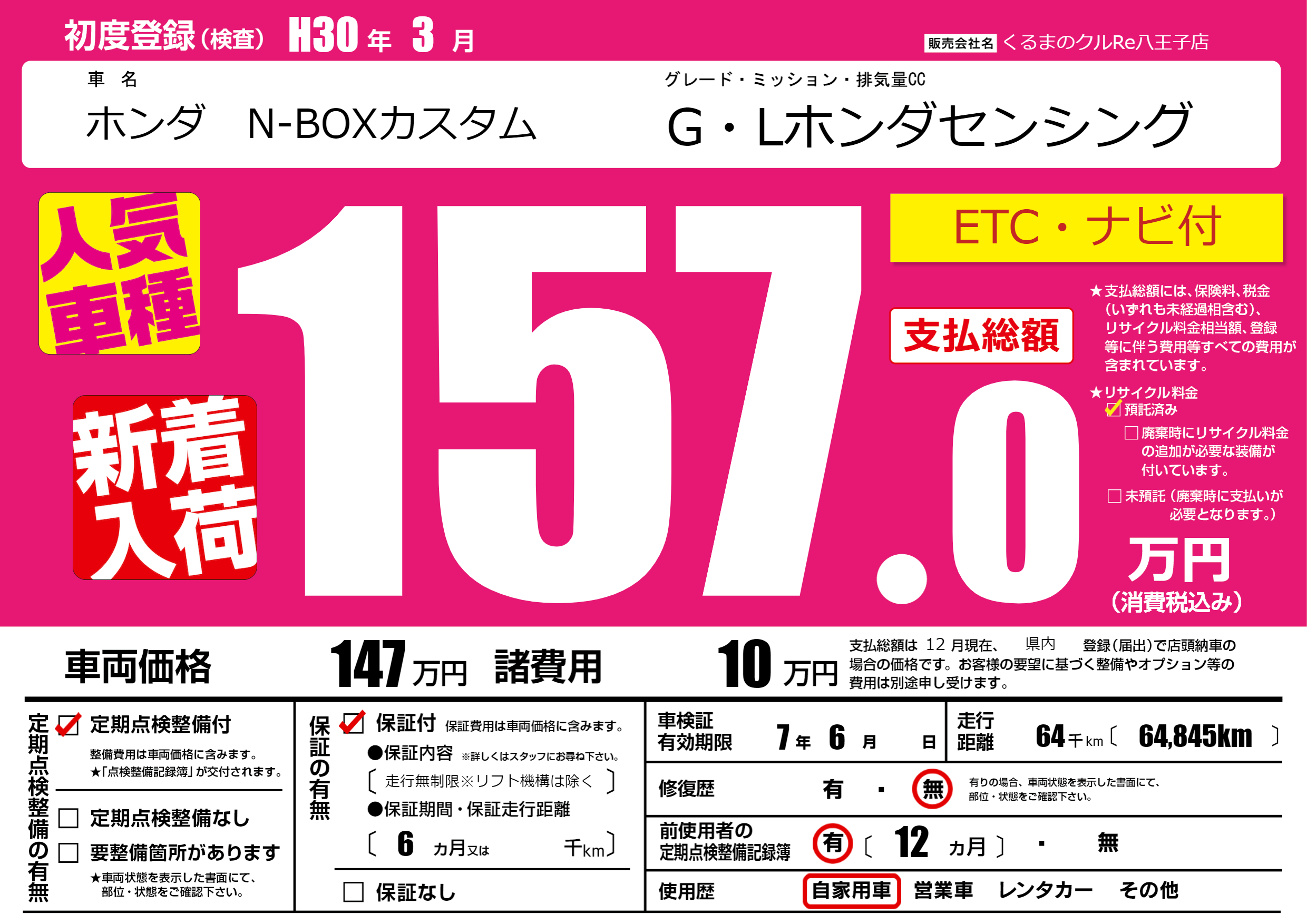 | 走行キロ | 6.4万km | 初年度登録 | H30年3月 |