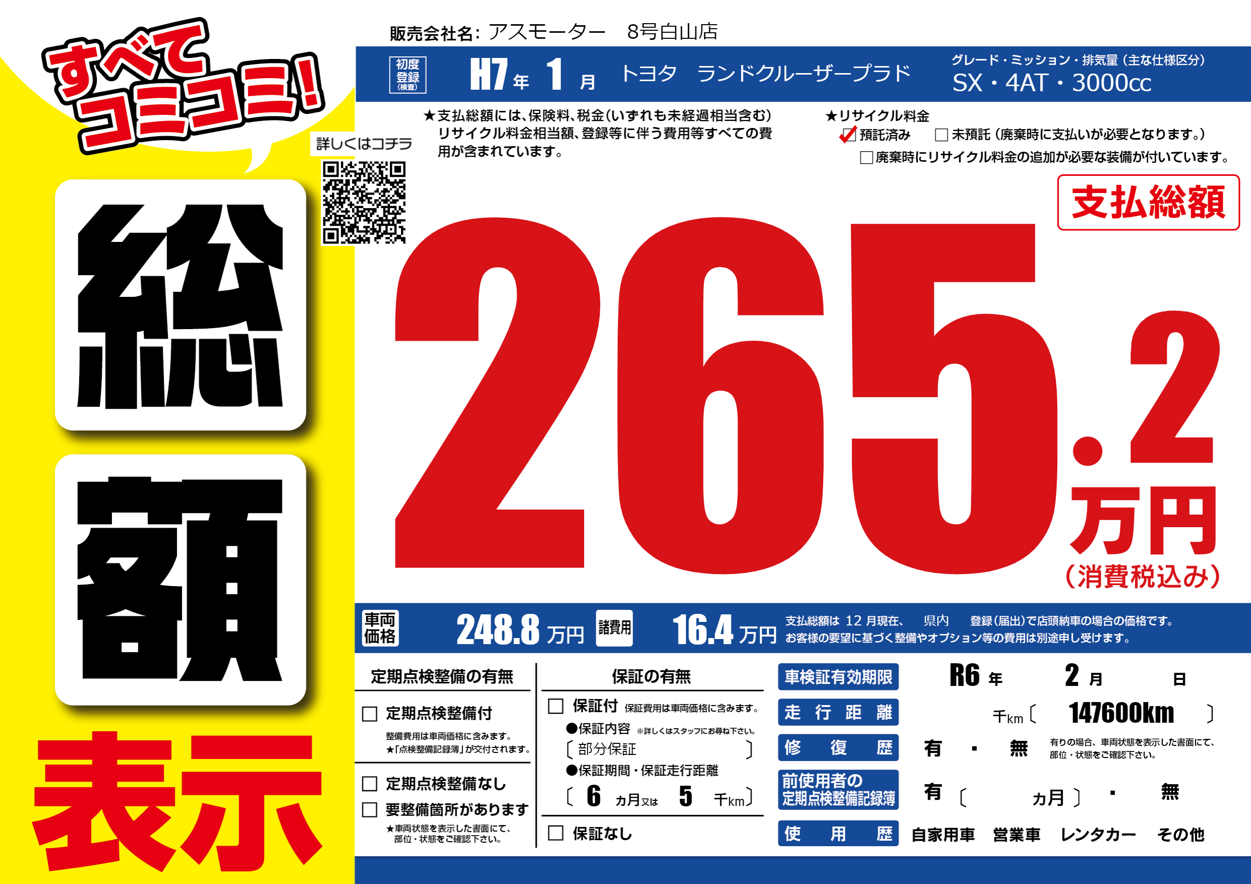 | 車名 | トヨタ ランドクルーザープラド | グレード ミッション 排気量 |