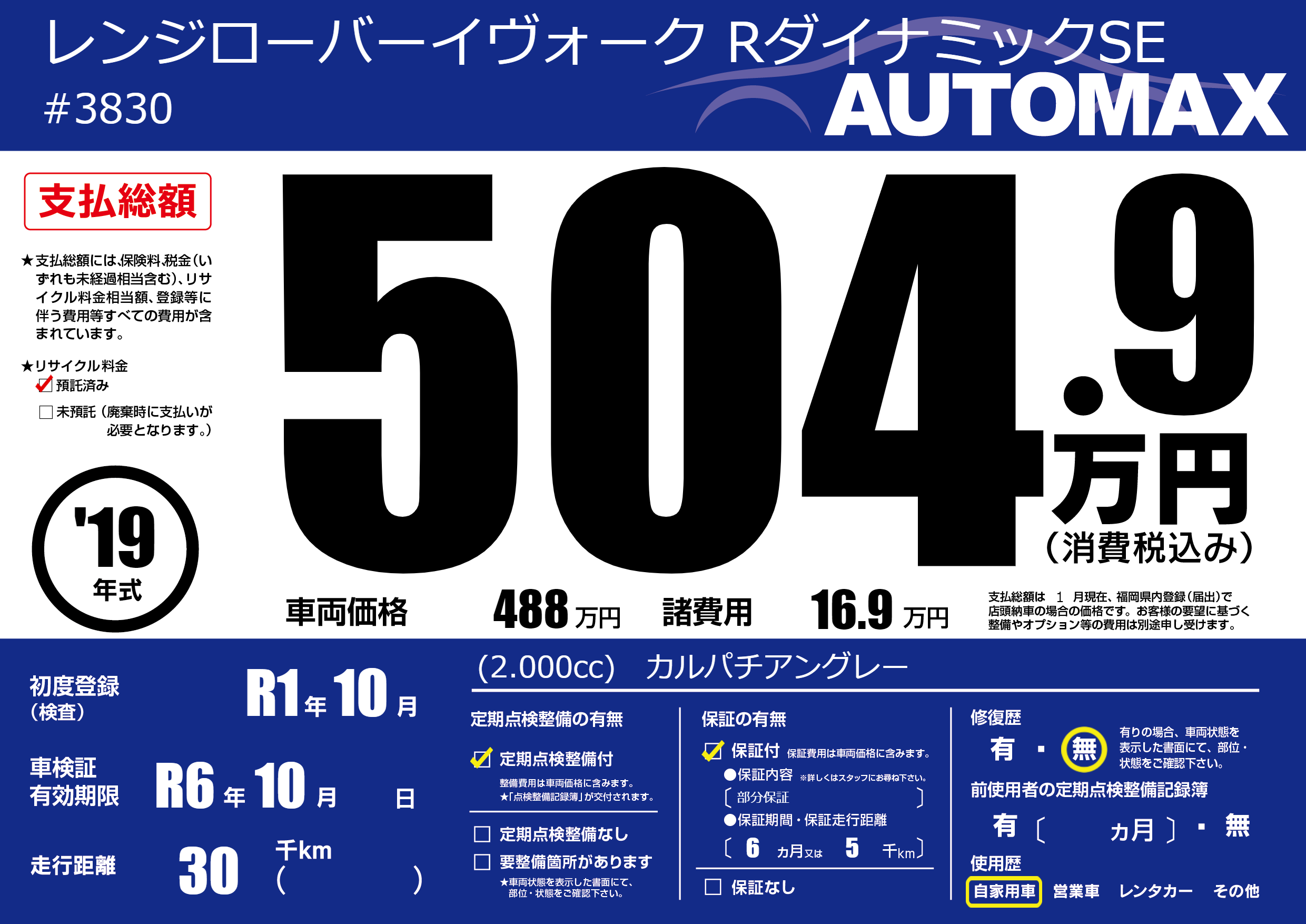 | 走行キロ | 3万km | 初年度登録 | R1年10月 |