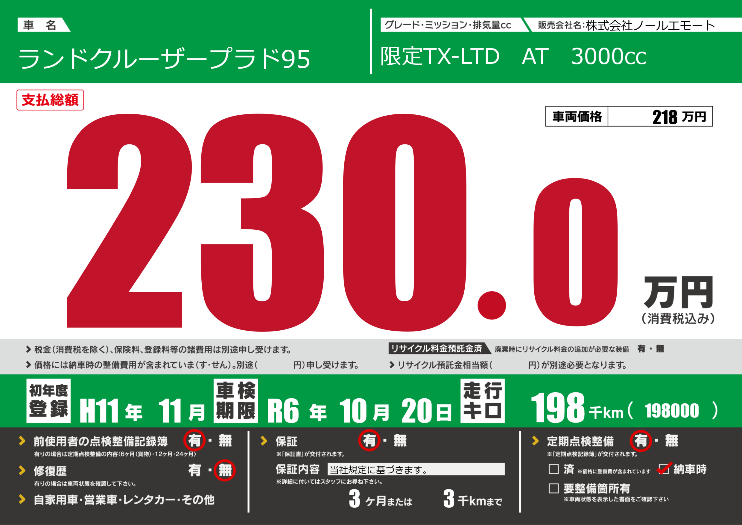| 車名 | ランドクルーザープラド95 | グレード ミッション 排気量 |