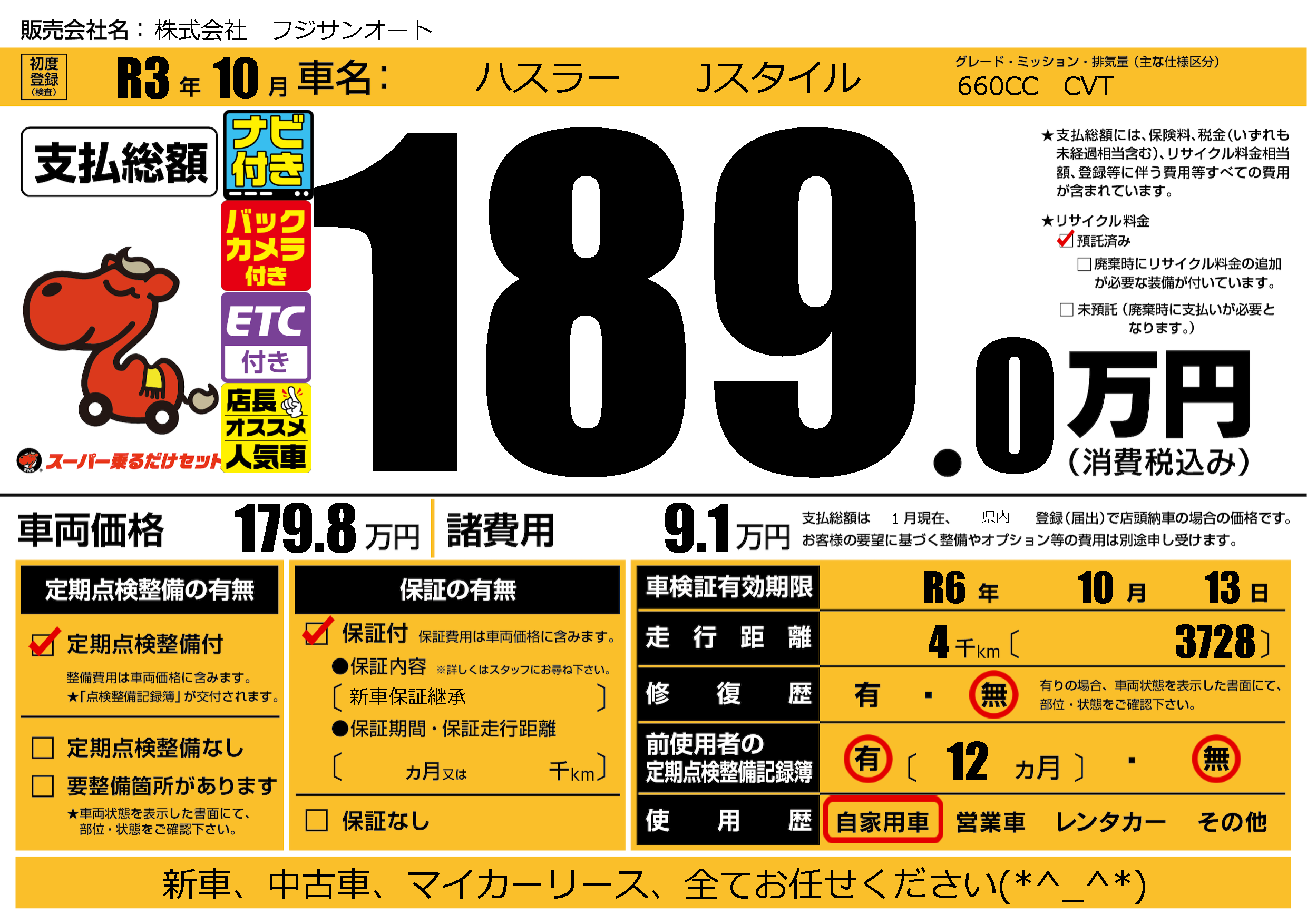 | 車名 | ハスラー Jスタイル | グレード ミッション 排気量 |