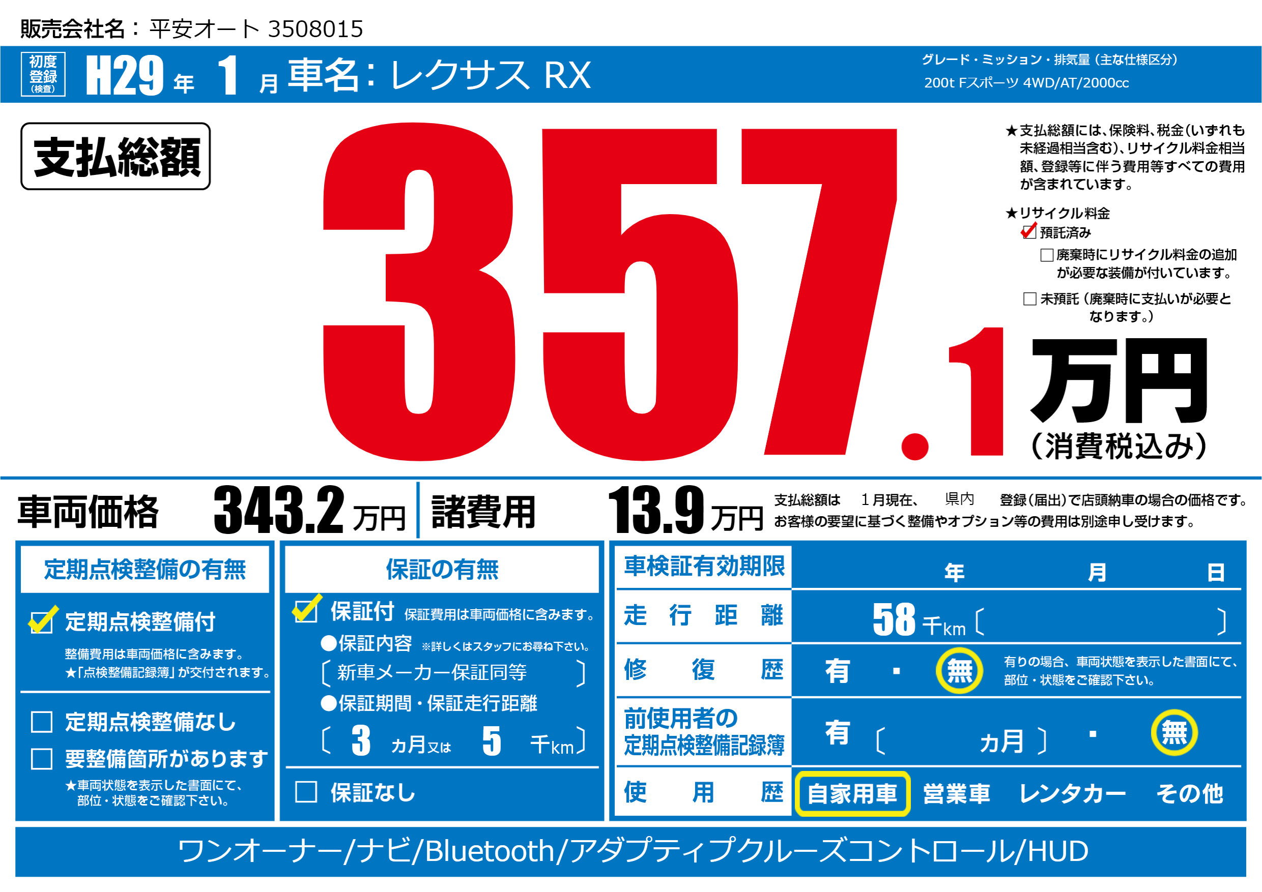 | 車名 | レクサス RX | グレード ミッション 排気量 |