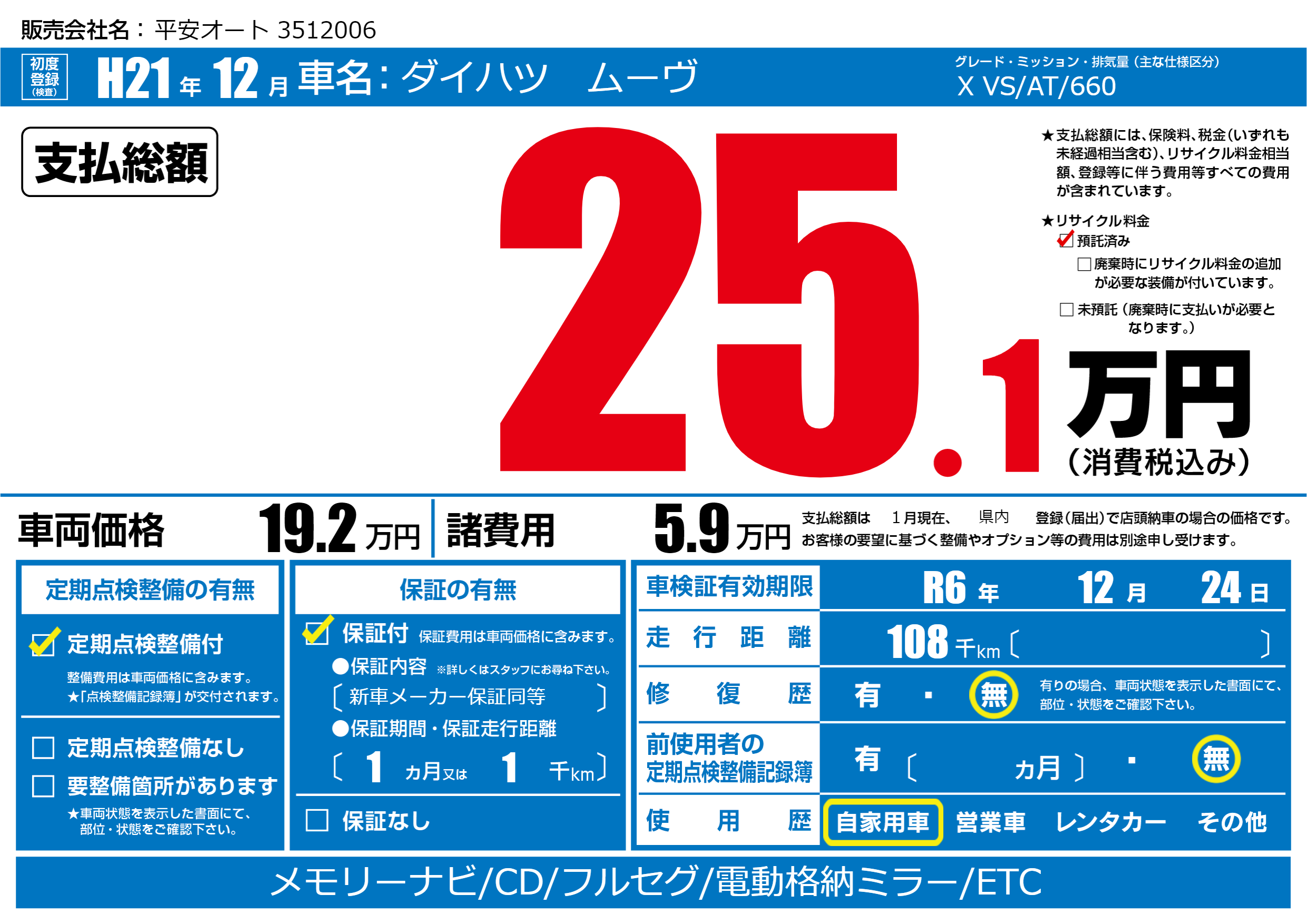 | 走行キロ | 10.8万km | 初年度登録 | H21年12月 |