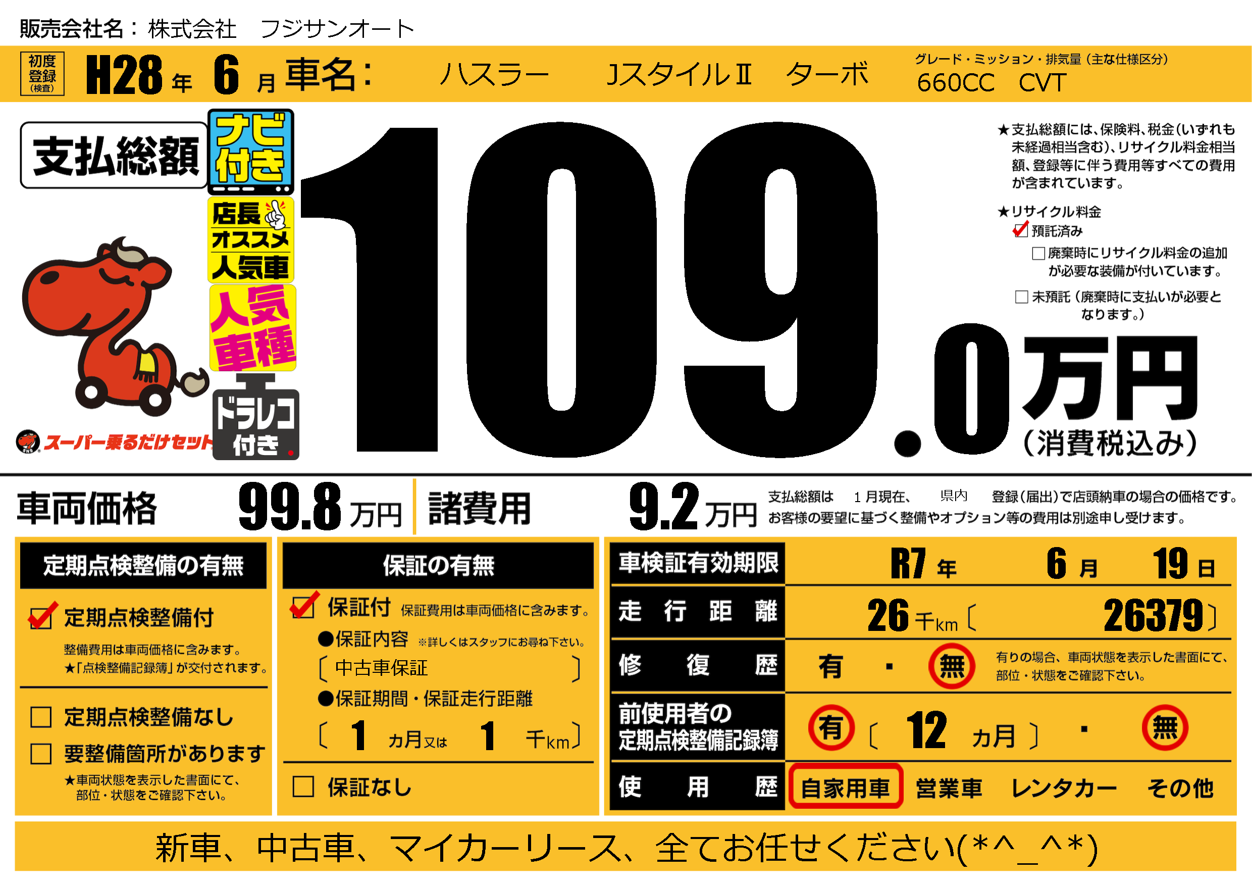 | 車名 | ハスラー JスタイルⅡ ターボ | グレード ミッション 排気量 |