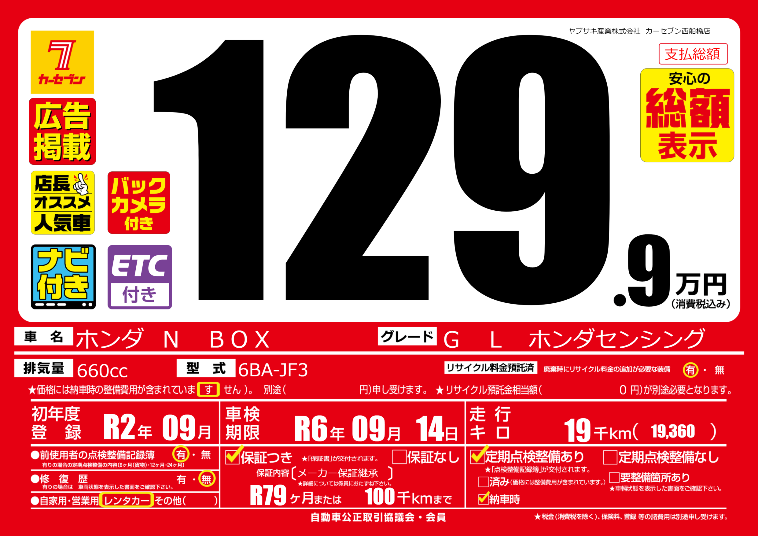 | 走行キロ | 1.9万km | 初年度登録 | R2年09月 |