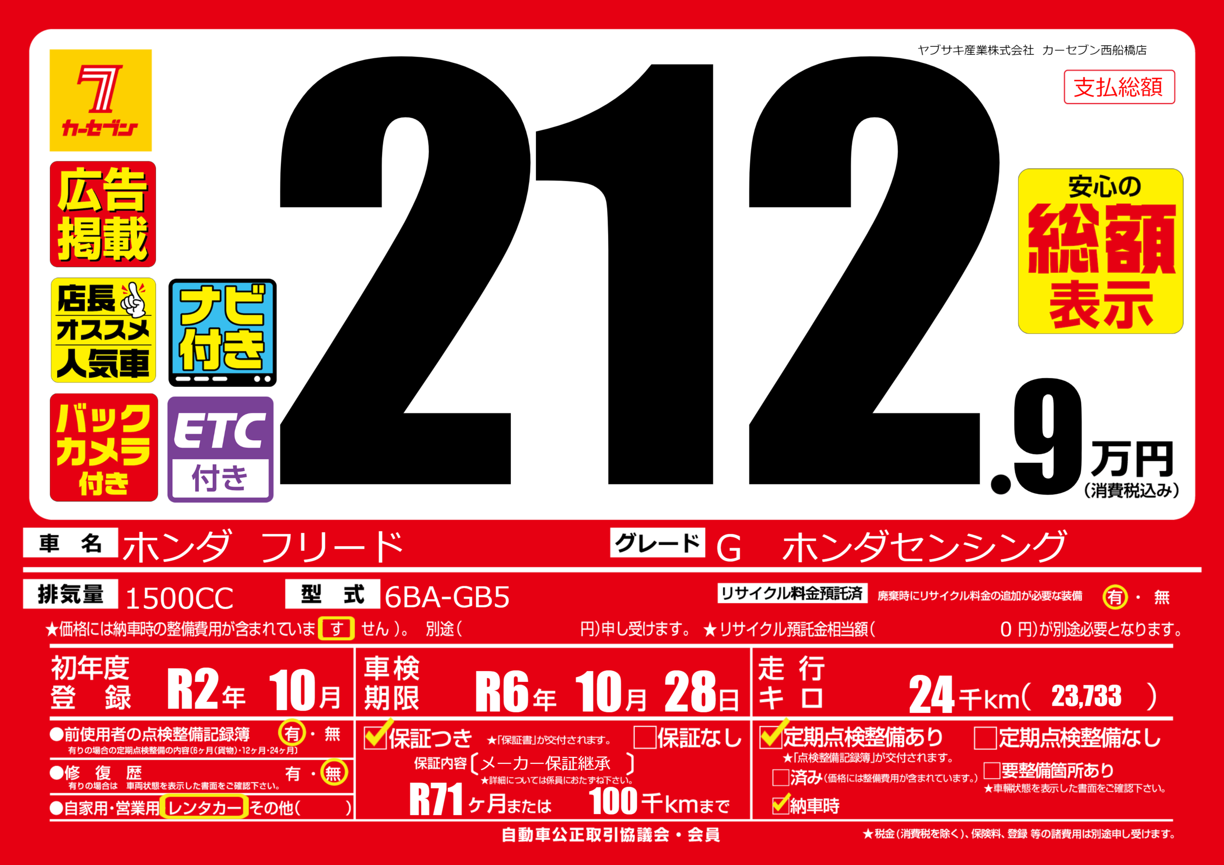 | 車名 | ホンダ フリード | グレード ミッション 排気量 |