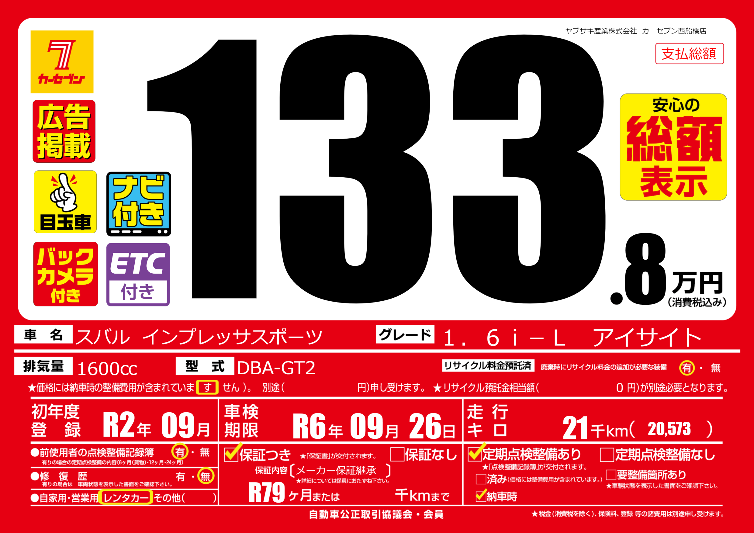 | 車名 | スバル インプレッサスポーツ | グレード ミッション 排気量 |