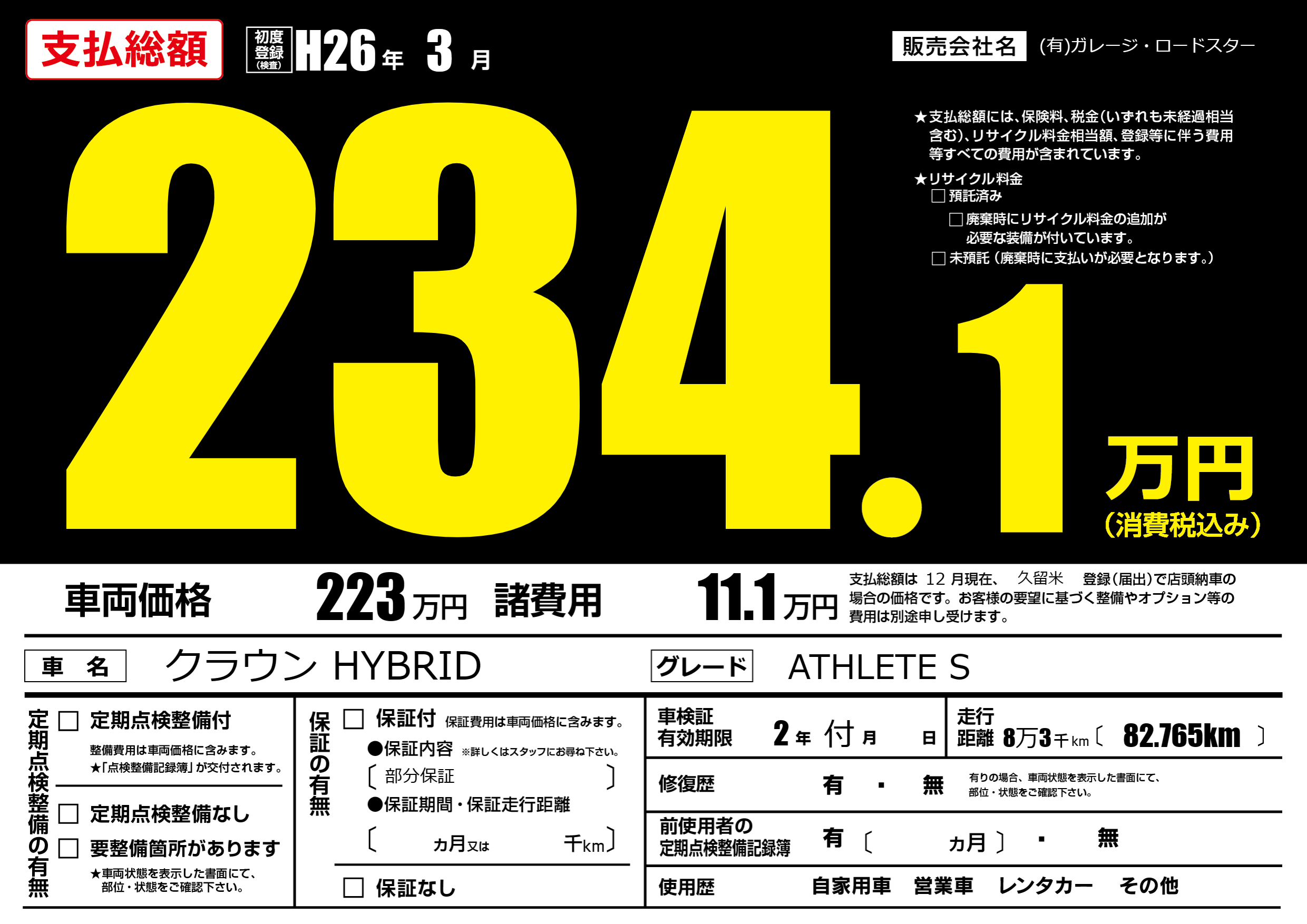 | 車名 | クラウン HYBRID | グレード ミッション 排気量 |